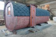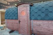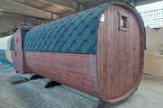 Размер увеличен: 2,3 на 5,9 метров. Изготовлена из еловой бочковой доски. Цвет: Акватекс «Махогон» + обводка Акватекс «Палисандр».