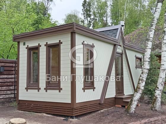 Комбинированная обшивка вагонкой и ступенчатая кровля придают бане современный и запоминающийся облик. Любые цветовые решения на ваш вкус.