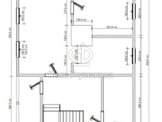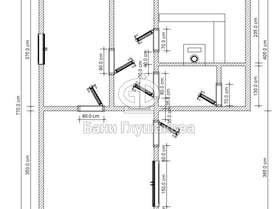 Планировка на 3 помещения: парная, душ, комната отдыха. Входная верь располагается посередине. Между помещениями устанавливаются стеклянные двери с магнитными замками.
