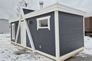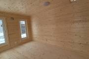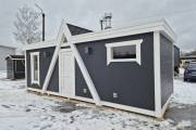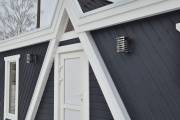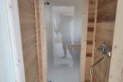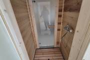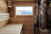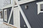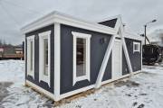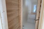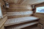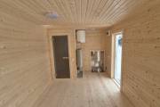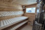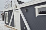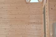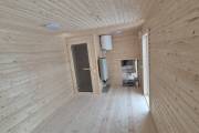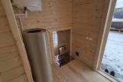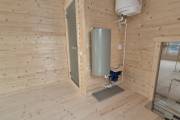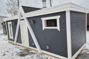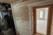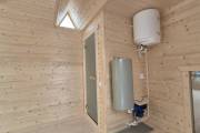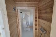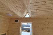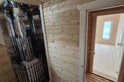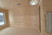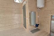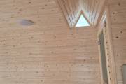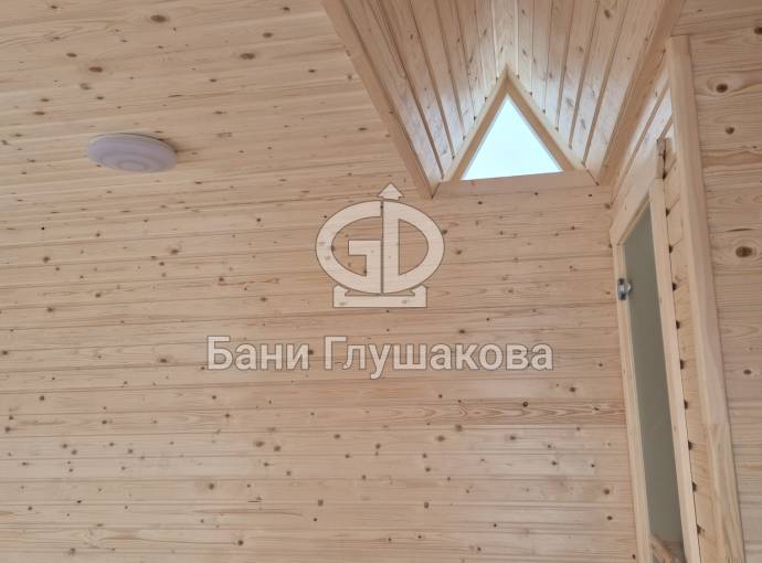 Баня каркасной сборки с необычным внешним видом. Утепление 150 мм. Снаружи обшита широкой вагонкой. Изнутри отделка бессучковой вагонкой АВ класса, мокрые помещения (душевая и парная) обшиты термовагонкой.