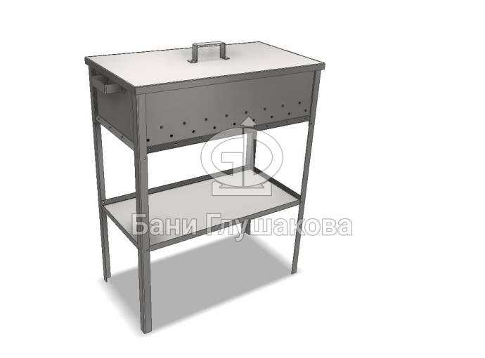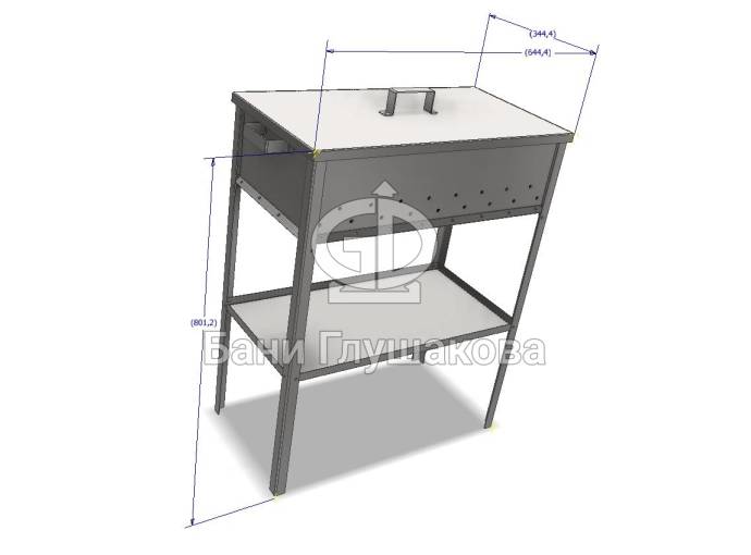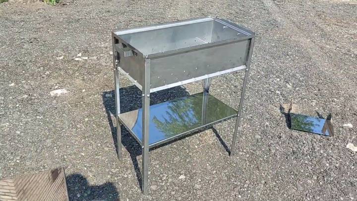 Металлический складной мангал с дополнительными рёбрами жёсткости сверху и снизу. Благодаря им при нагреве стенки мангала не изгибаются. Изготовлен из нержавеющей стали 3 мм. Оснащён нижней полкой.