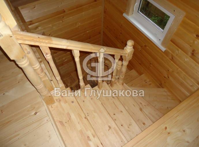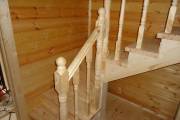 Здесь фото некоторых лестниц, установленных в наших домах и банях. Посмотрите на качество обработки ступеней, перил и балясин: всё тщательно зашлифовано, нет никаких расщеплений, трещин и сколов. Саморезы закручены аккуратно и незаметно — не портят внешний вид лестницы. Ступеньки довольно широкие и удобные. Тут важно соблюдать баланс между комфортом эксплуатации и компактностью.