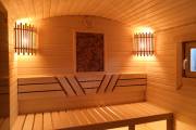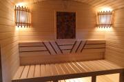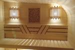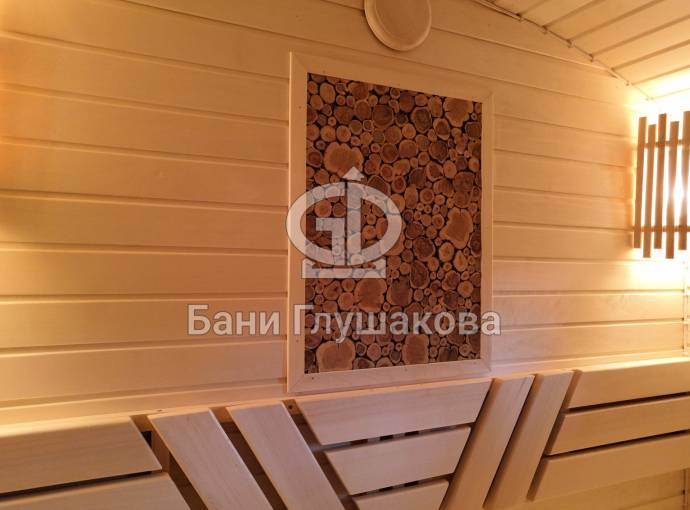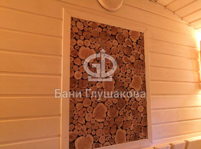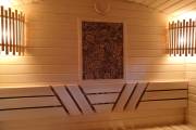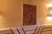 Панно не просто висит на стене — оно встроено в стену бани и находится примерно в одной плоскости со стенкой.