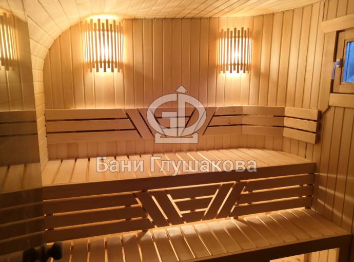 Впервые в бане из линейки «Дважды закруглённые» были установлены красивые декоративные спинки для пологов — получилось необычно и очень симпатично. Теперь их можно заказать в качестве дополнительной опции в загруглённых и дважды закруглённых банях.
