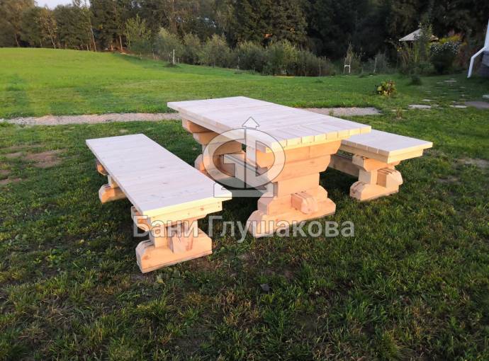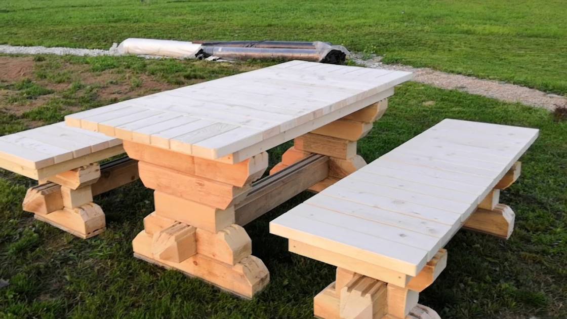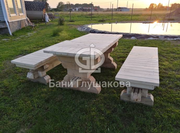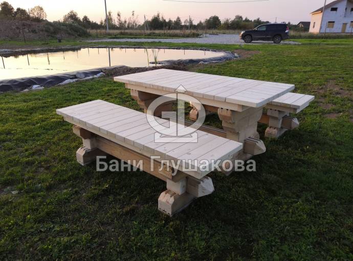 Стол и скамейки потом будут покрашены лаком — сносу им не будет. Попозже снимем видео в эксплуатации.