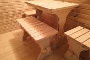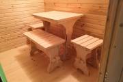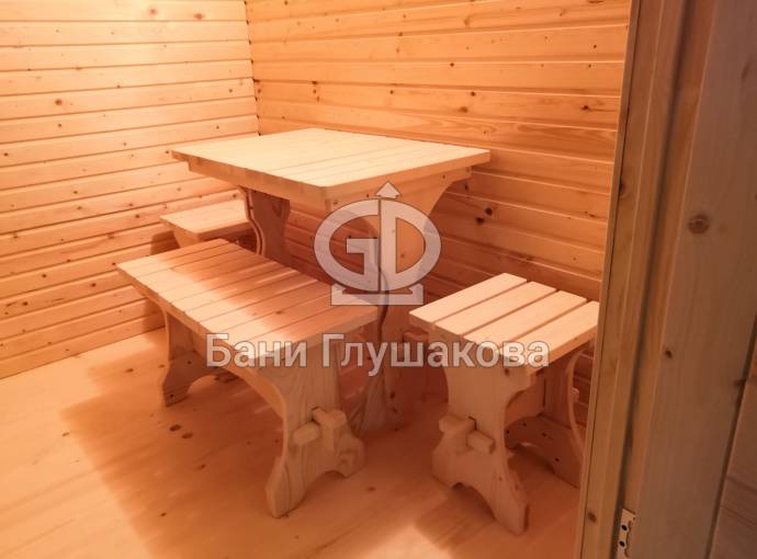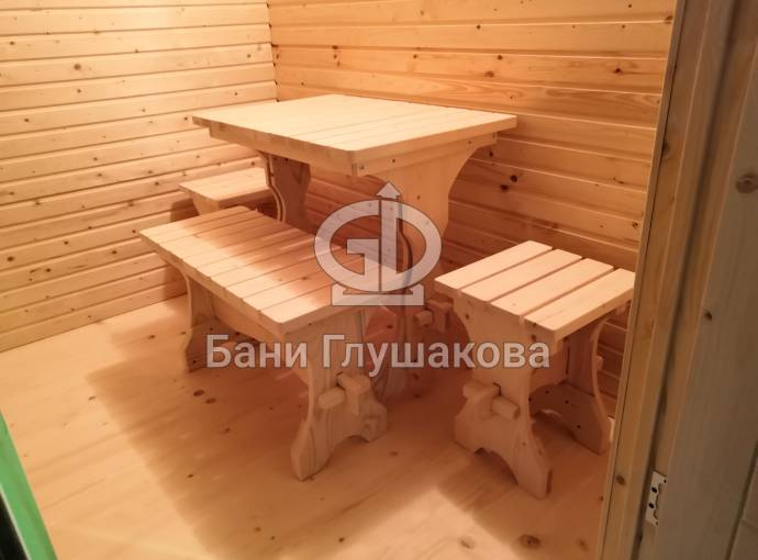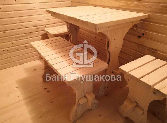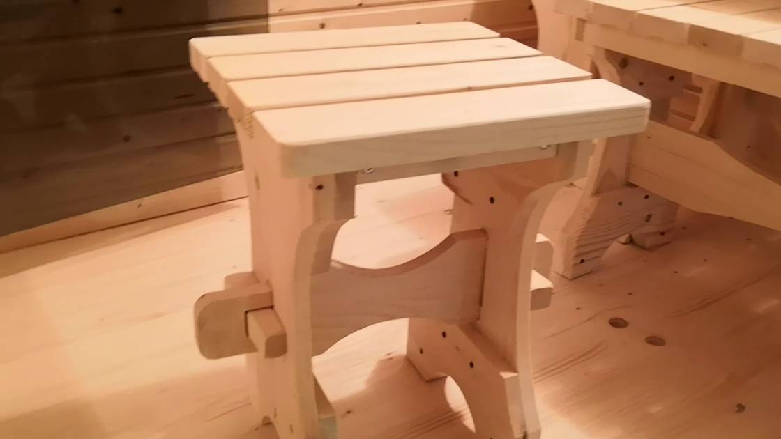 Теперь в нашем базовом комплекте мебели для бани можно заменить скамейку на два табурета в том же стиле. Это имеет смысл, когда места в бане не очень много и разместить полноценную скамью очень сложно.