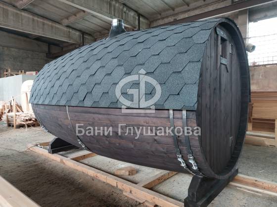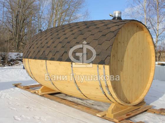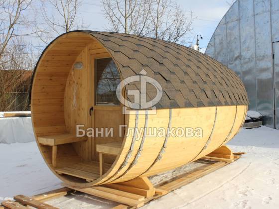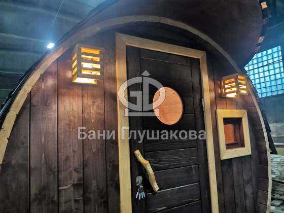 При этом баня выглядит как настоящая бочка — с симпатичными выпуклыми боками.