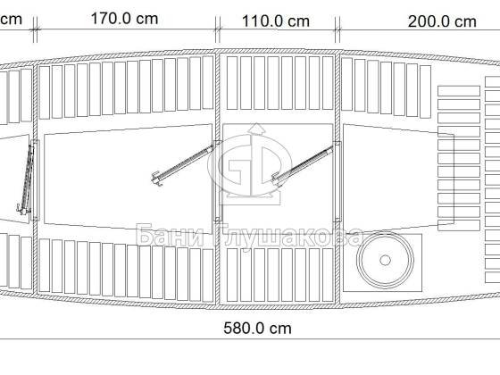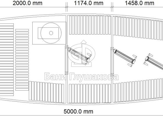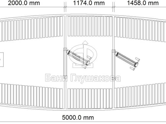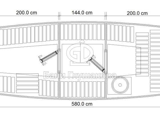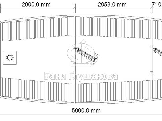 Увеличенный диаметр позволяет поставить пологи углом — вдоль одной стены и задней стенки. Сбоку остается место для печки (в круглых банях печь ставится между пологами у задней стены). Так удобнее. В видео все показано (при нажатии кнопки PLAY воспроизведение начнется с 1:35 минуты, там сразу про парную):