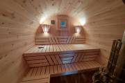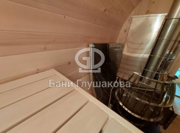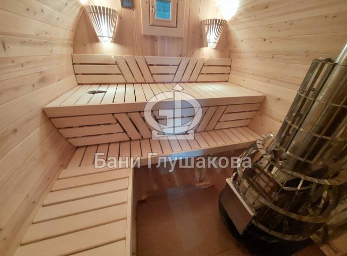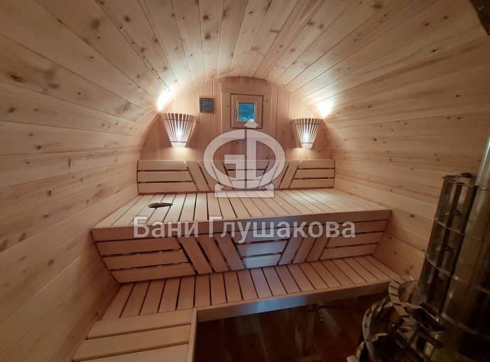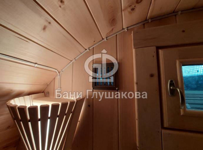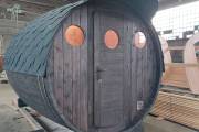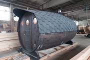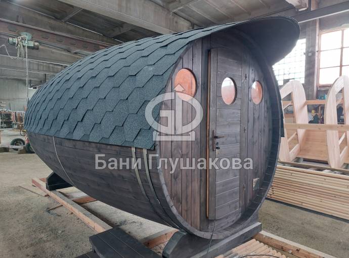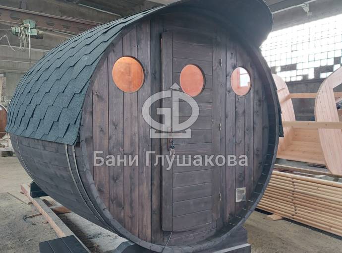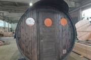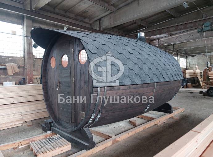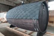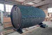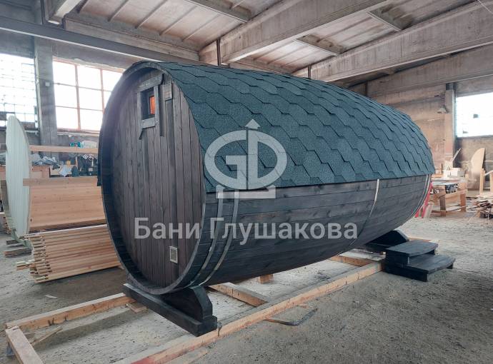 Четырёхметровые выпуклые бани выглядят один в один как винные бочки. Именно на этом размере лучше всего видна объёмность.
