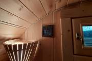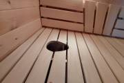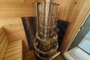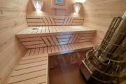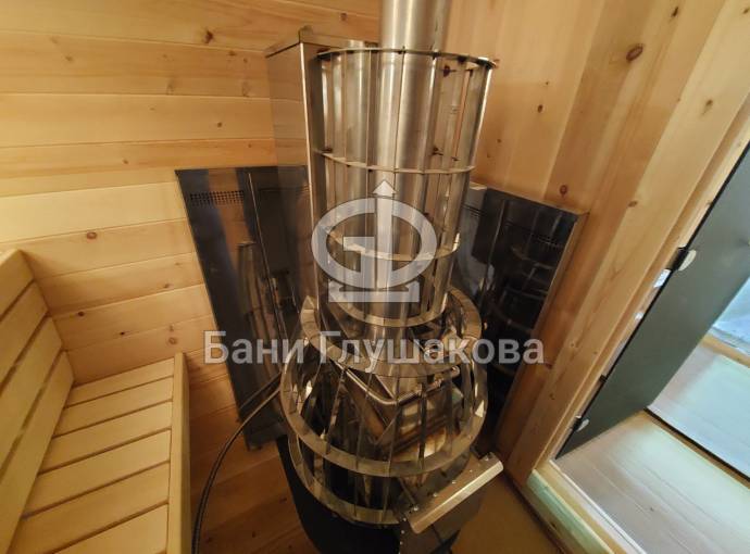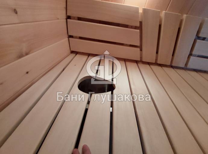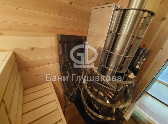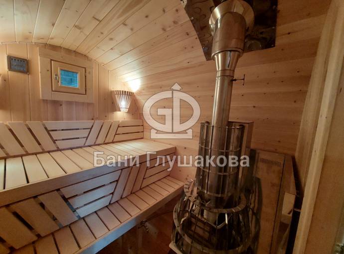 Внутри 2 помещения: предбанник и парная. Сделаны скамья-сундук, откидной столик, вентиляция «второе дыхание». Поставлены печь с каменкой на трубе, металлические клапаны-задвижки.