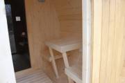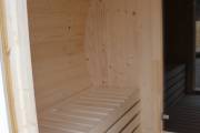 Небольшая, красивая, аккуратно собранная баня бочка укомплектована лучшим образом: здесь и надежная печь-каменка с баком для воды, и окошко в парной, и откидные скамейки с ящиком для хранения, и столик сбоку.