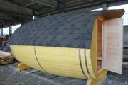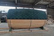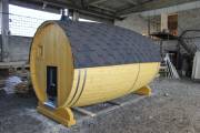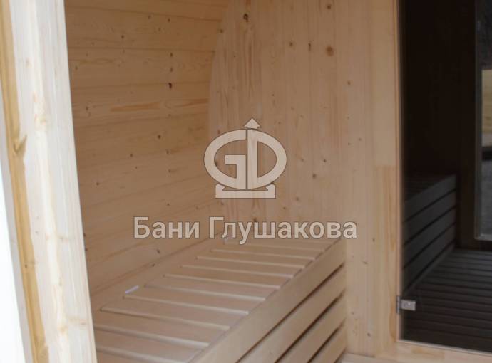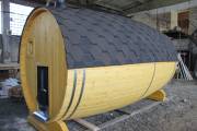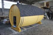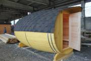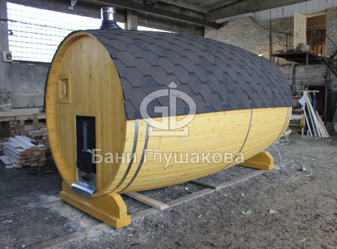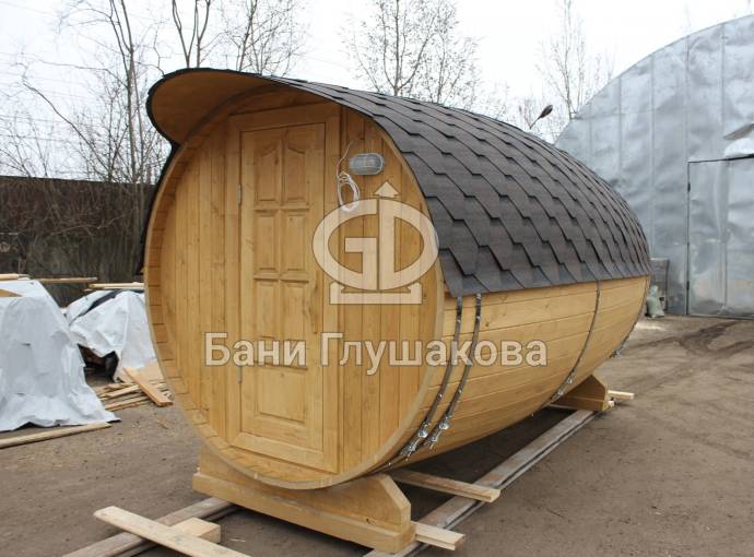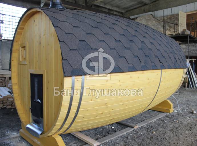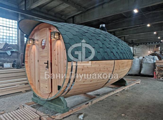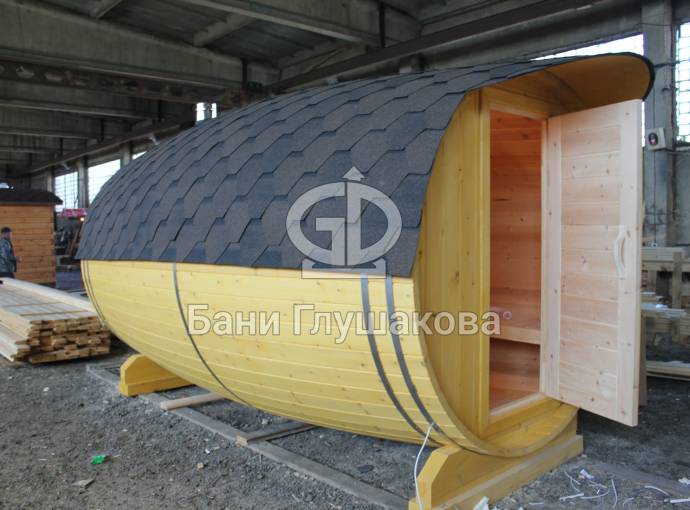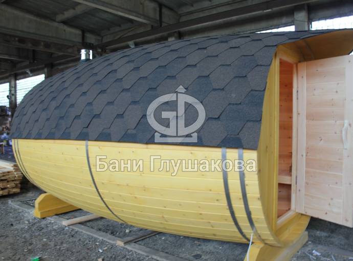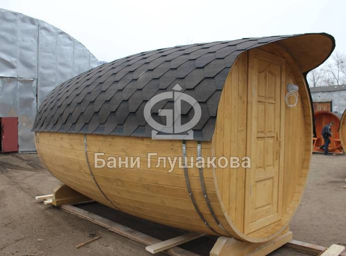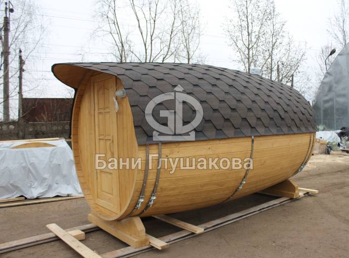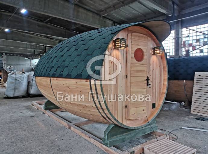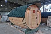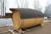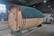 Перевозная баня бочка «Можайск» с выпуклыми боками — прекрасный образец оригинальной линейки «Настоящих бань».