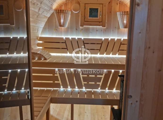 Можно установить один или более светильник у входной двери бани бочки снаружи, подробнее по ссылке, в комплект входит покраска его в цвет окантовки бани, подключение на отдельный выключатель, светодиодная лампа. Стоимость 1700 рублей за штуку