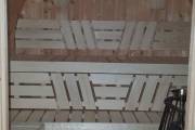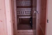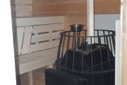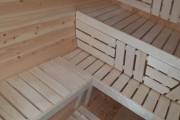 Баня изготовлена из кедра. Размер самый замечательный: 2,4 на 5,8 метров — просторная. Внутри 3 помещения: предбанник со скамейкой-сундуком, моечная и классная оборудованная парная.