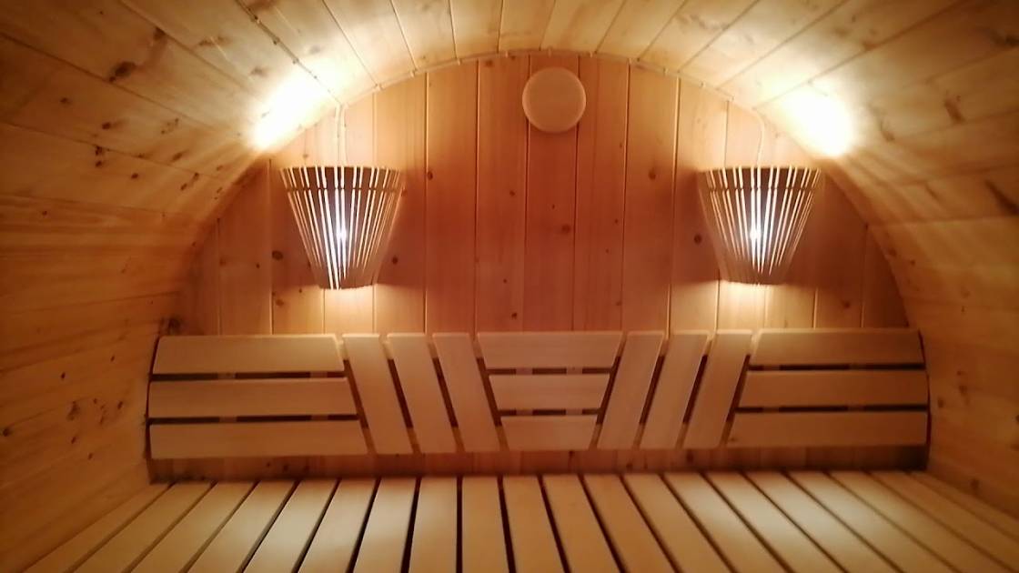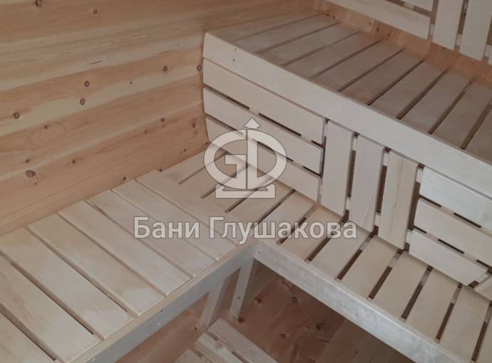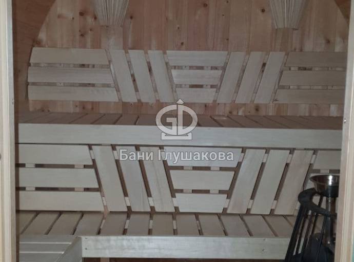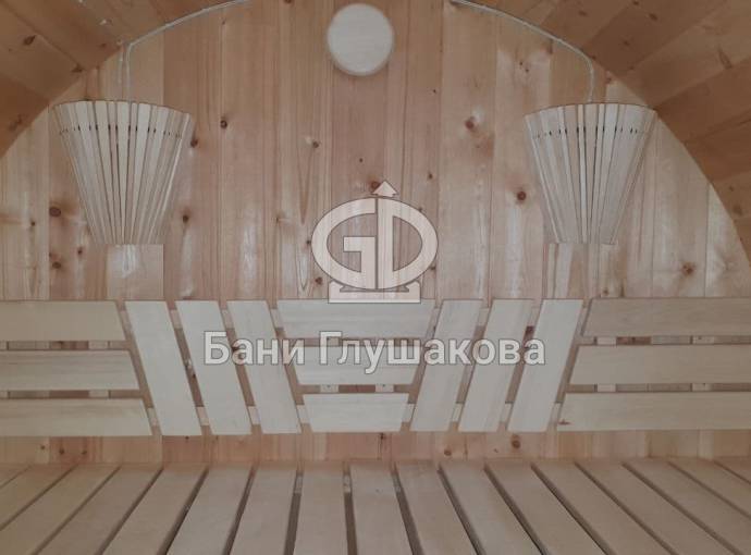 Благодаря увеличенному диаметру бани получилось поставить двухуровневые широкие полки углом. Сбоку стоит печь Бочонок Компакт без бака на трубе. Также сделана нижняя подсветка для создания уютной атмосферы.