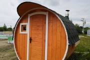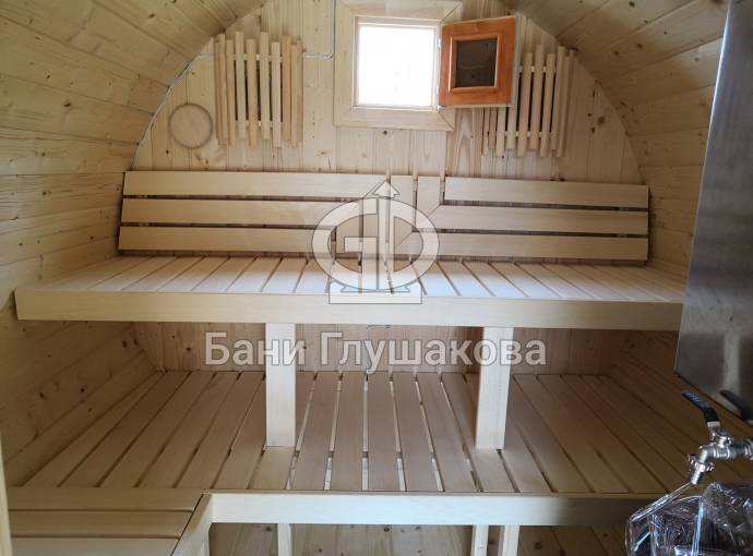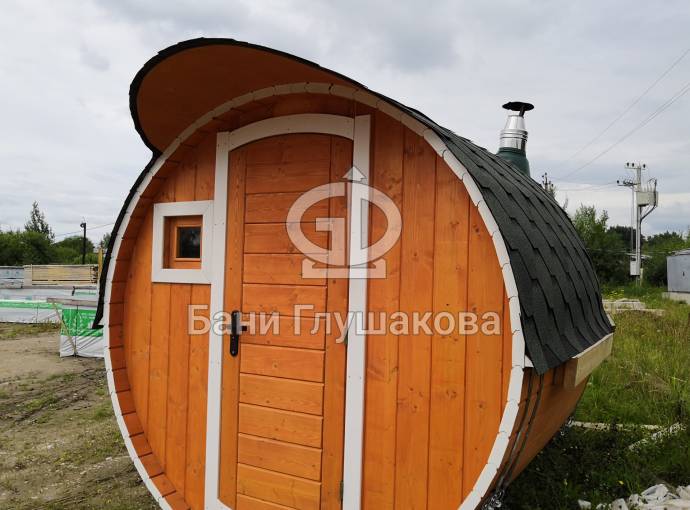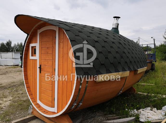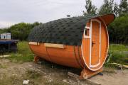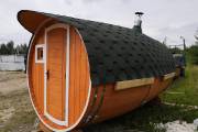 На выставочную площадку в Санкт-Петербурге на площадке у ТЦ Мега на Дыбенко привезли новый образец выставочной бани бочки из линейки «Настоящие». Выпуклые бока этой красавицы позволяют увеличить диаметр бани — размер 4х2,4 (диаметр обычной бани бочки 2,1 м).