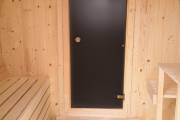 Внутри всего 2 помещения: комната отдыха и парная, которая по совместительству служит помывочной. Бочка снаружи покрашена в 2 слоя антисептиком Биотекс Классик Универсал цвет «Клён» + белая обводка. Сочетание очень нарядное. Впервые попробовали сделать на входной «Карабельной» двери наличник и покрасить его в цвет обводки. Получилось симпатично, думаем, что новшество приживётся.
