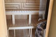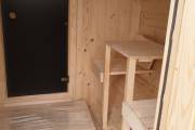 Внутри как обычно красота: в предбаннике установлены столик с двумя сидячими местами и напротив скамейка с откидной крышкой. В парную установлена матовая стеклянная дверь. Печь установлена сбоку, поэтому была возможность установить углом двухъярусный полог. Нижний ярус удлинён (дополнительное место для хранения), сделана декоративная спинка полога. Повешены красивые абажуры и сделана нижняя подсветка. Форточка, вентиляция — всё по уму.