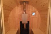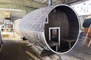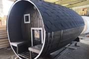 Перед вами пример выпуклой бани бочки из кедра, выполненной в полном соответствии с пожеланиями клиента — здесь топка вынесена на террасу с задней стороны бани. До этого мы подобного не делали.
