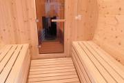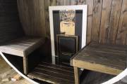 Снаружи стены покрашены в 2 слоя Биотексом «Палисандр» с нарядной белой обводкой. Внутри 2 отделения: предбанник и парная. Уже в цеху баня полностью готова к использованию. Осталось отвезти на участок, установить на фундамент и провести пробную затопку.