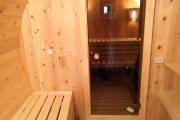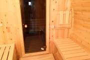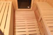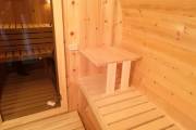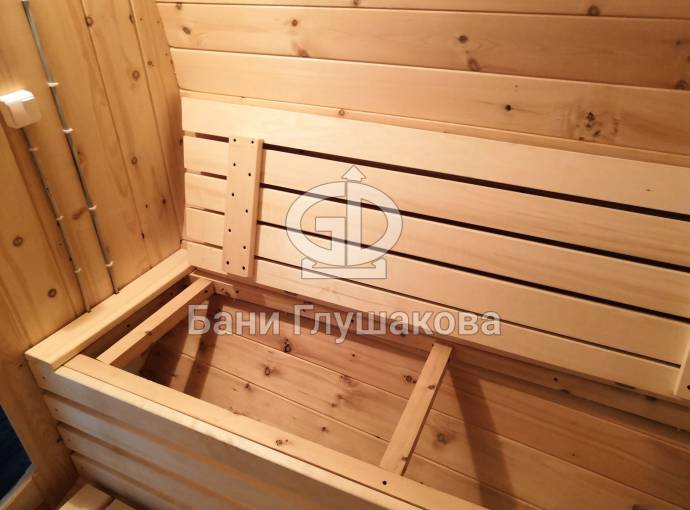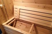 Снаружи отделка в наших лучших традициях, а вот внутри встречаются детали по задумке заказчика. Так мы установили скамейку с откидной крышкой, которая будет использоваться в качестве ящика для хранения. Напротив — небольшой столик.