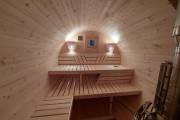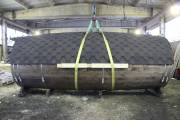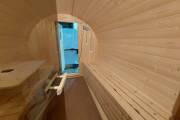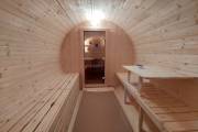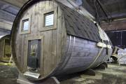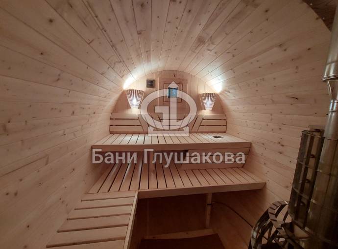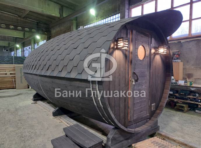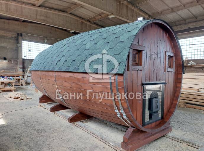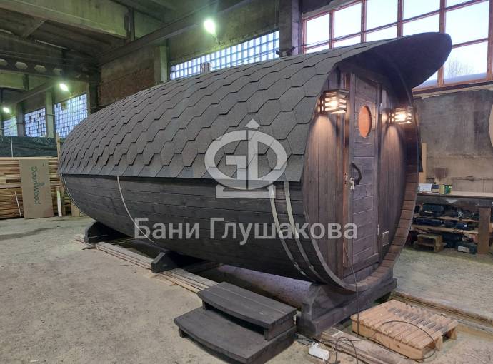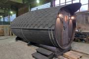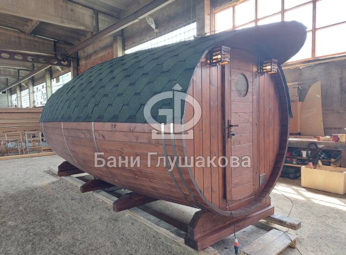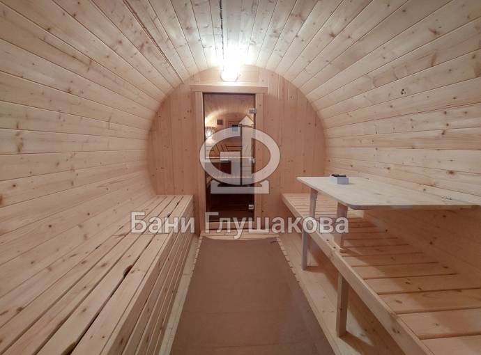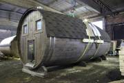 Представляем вам недорогую перевозную баню бочку «Талдом» уникальной выпуклой формы. Длина составляет 5 метров — это средний размер для мобильной бани, однако несмотря на скромные размеры эта модель имеет отличную планировку. Пространство внутри бани разделено на две практически равные по площади зоны: уютную парилку с уже установленными печью и полками; и комнату отдыха.