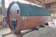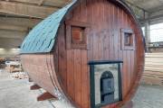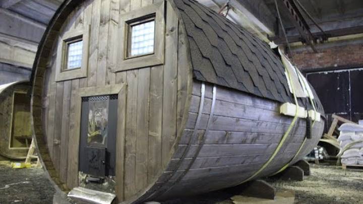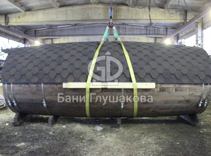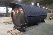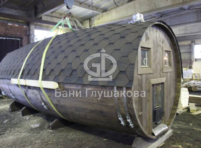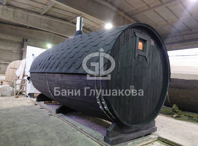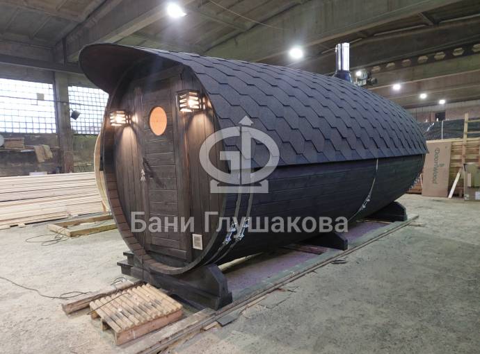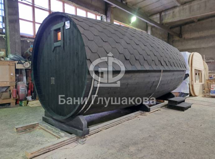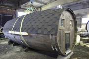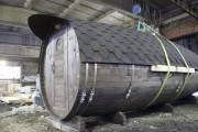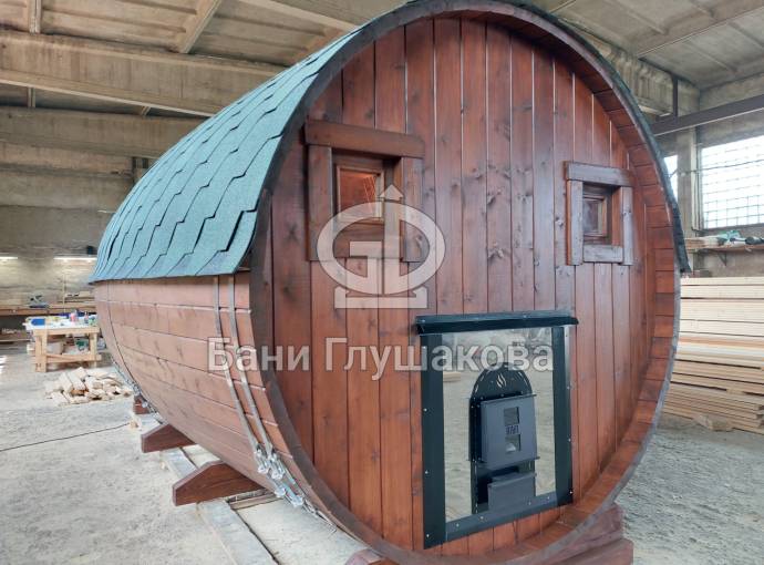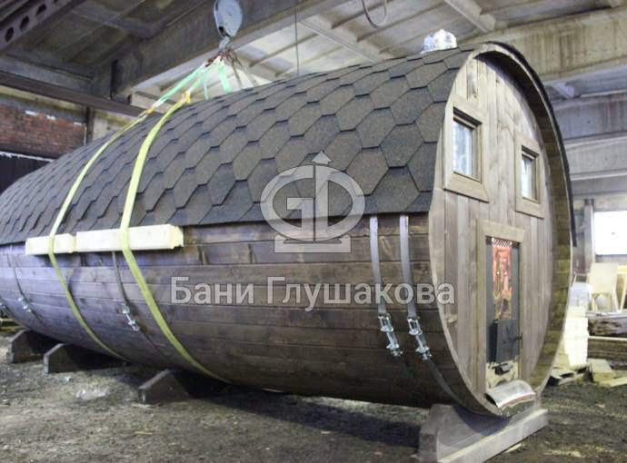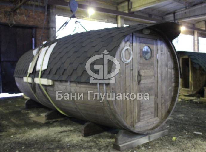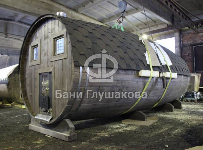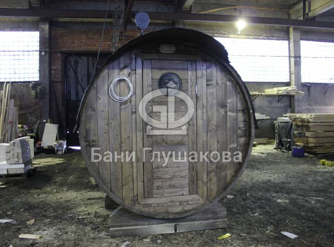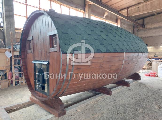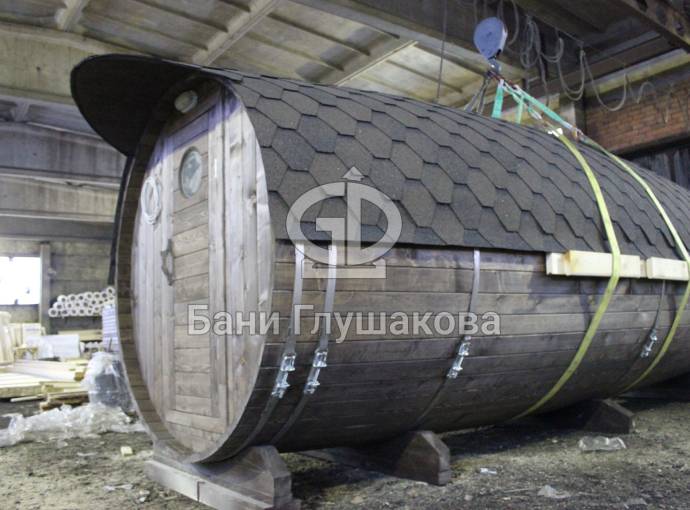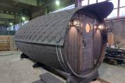 На фото представлены разные варианты бани бочки «Талдом» под ключ. Во время подготовки договора клиент формирует свои пожелания к готовой бани, вносит правки и изменения в предложенные проекты. Так вариативны размер, наличие козырька, террасы, душевой кабины, марки печного оборудования, модель входной двери, цвет и многое другое.
