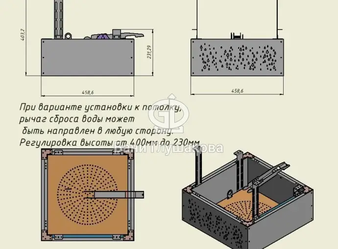 Мы сконструировали свой вариант металлического обливного устройства для бань и саун с хитрым механизмом. Он позволяет регулировать поток воды и останавливать его. Расход воды меньше — значит больше обливаний можно совершить.