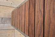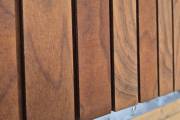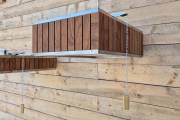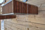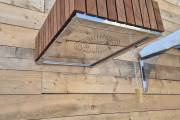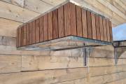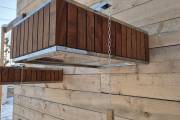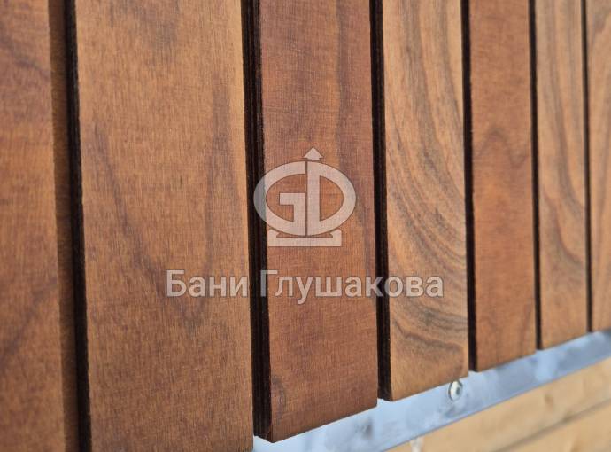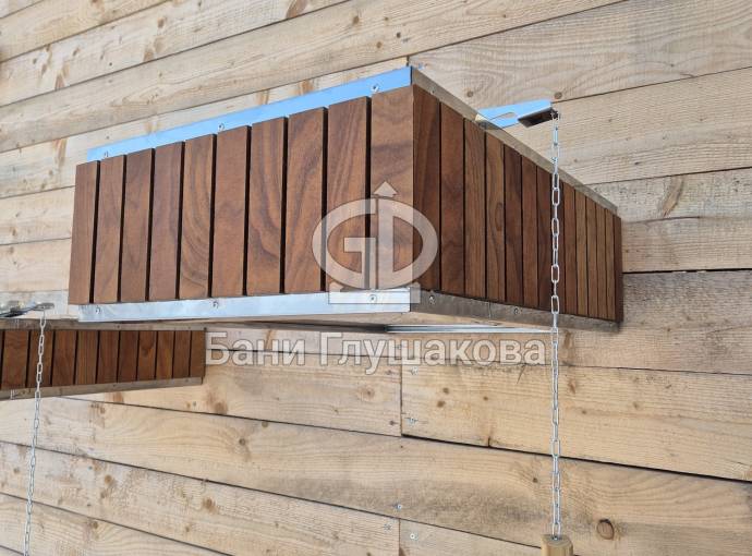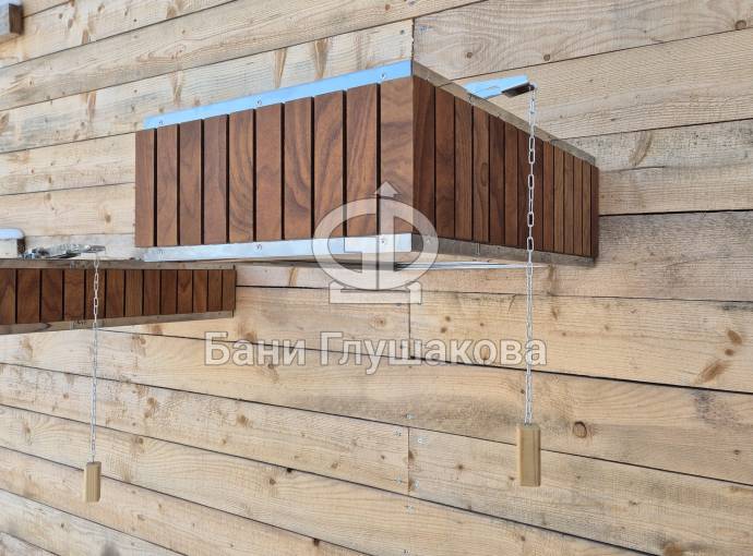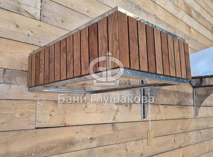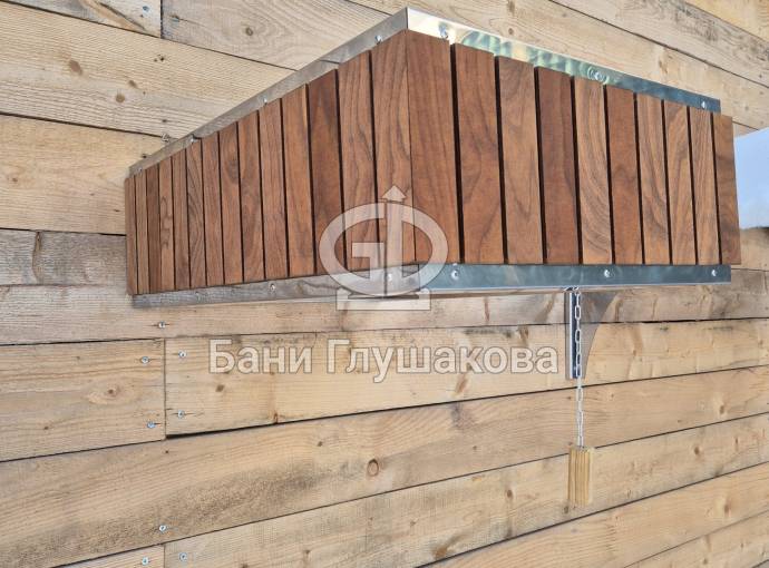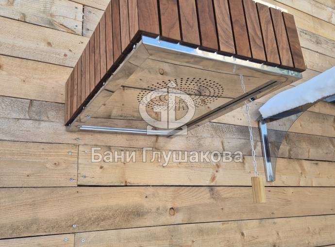 Обливное устройство «Водопад» комплектуется консольным креплением к стене. Отделка выполнена из термофанеры – такой тёмный насыщенный цвет это именно цвет термодерева. Кроме масла больше никакой пропитки не было. Термофанера не гниёт и не трескается – обливное устройство на долгие годы сохранит первоначальный вид.