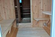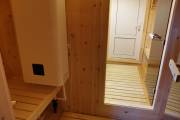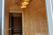 Особенно классной получилась кедровая парная. Здесь двухъярусный полог поставлен углом. Сделаны и красивая спинка, и удлинённый нижний ярус. Повешены 2 красивых абажура. Печь клиент покупал сам Feringer Уют — ставили такую впервые. Обязательно расскажем, как она покажет себя в эксплуатации.