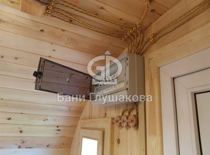Входит в стоимость. Включает светильники в каждом помещении, вводный автомат, негорючий провод в парную, розетка в комнате отдыха (в банях-бочках розетка устанавливается по требованию).