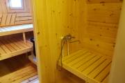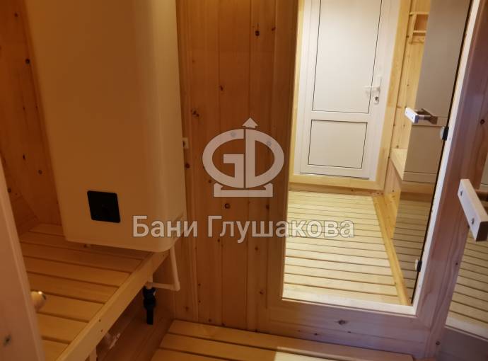 Можно установить насосную станцию, бойлер, бак, душ, устанавливается как в душевой комнате так и в маленькой бане, но уже слева или с права в комнате отдыха, а душ выводится в этом случае в парную.