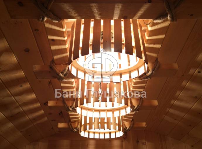 Модель делалась по специальному заказу. Собрана из кедровой бочковой доски второго сорта. Пусть вас не смущают сучки — в кедре первого сорта, из которого мы строим бани на продажу, их немного меньше. Эксплуатации никак не мешают. Изюминка — входная дверь в виде стеклопакета с большим стеклом. Ставим такие в качестве дополнительной услуги. И обратите внимание на классный светильник «Тринити», его также можно установить в баню большого размера.