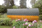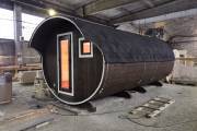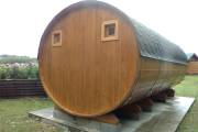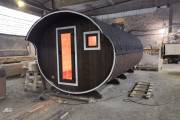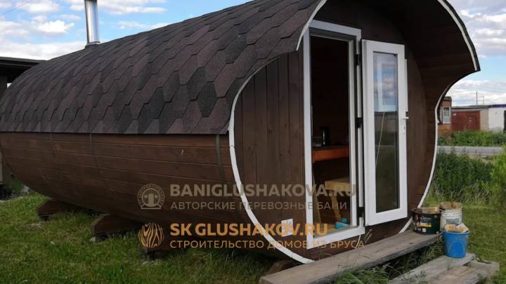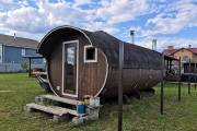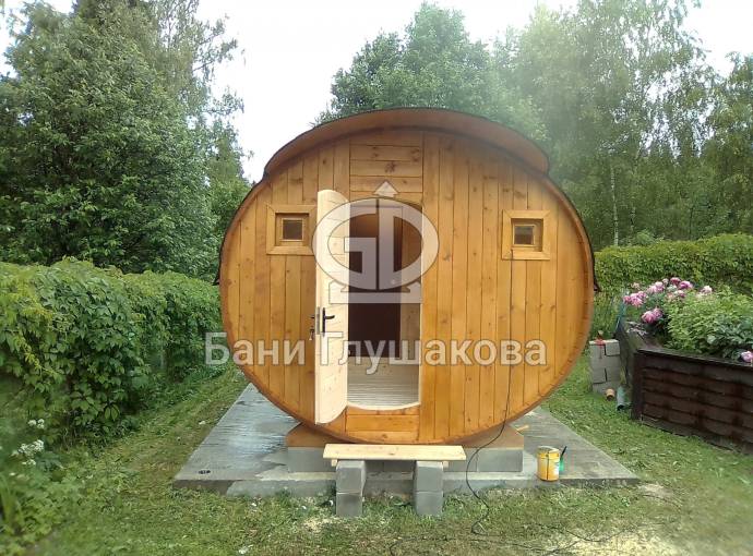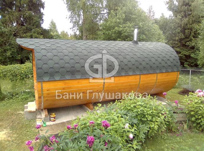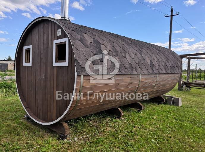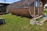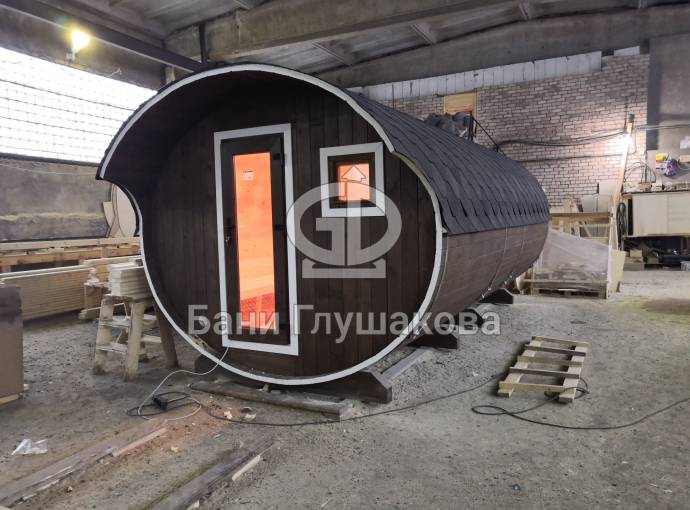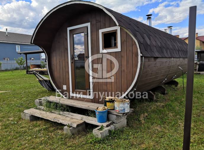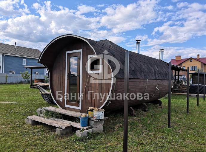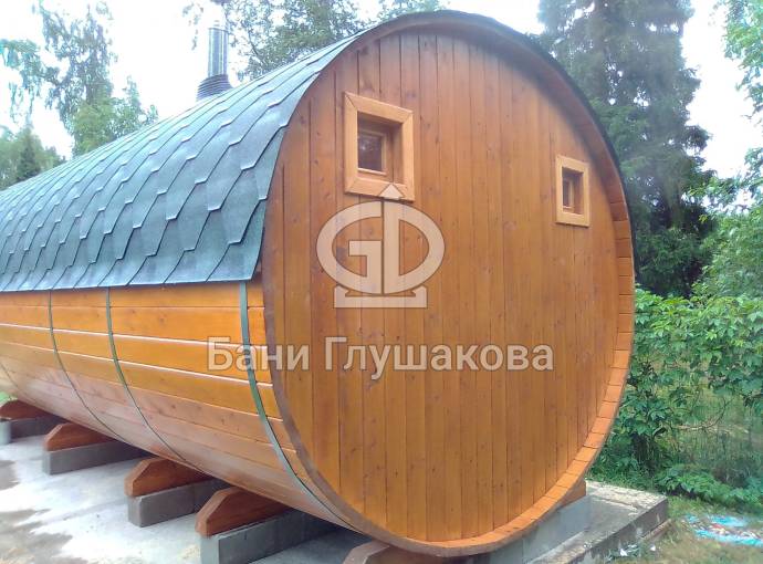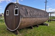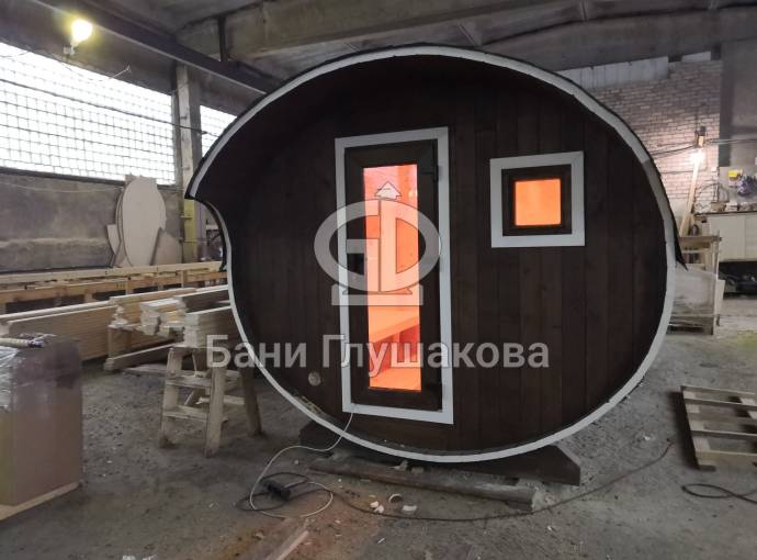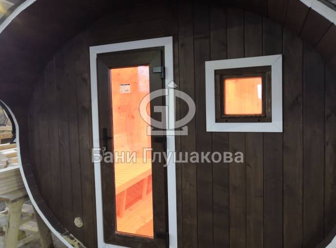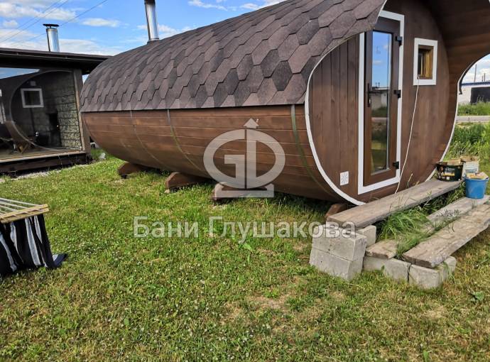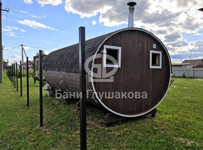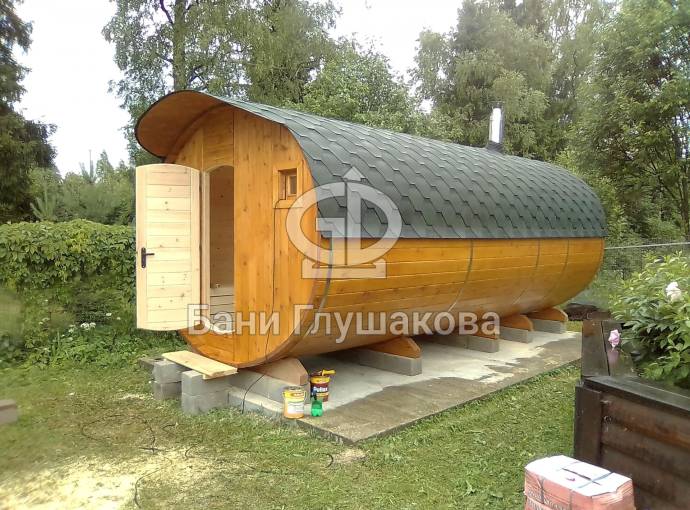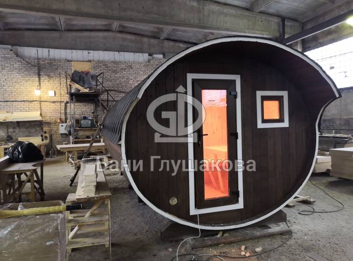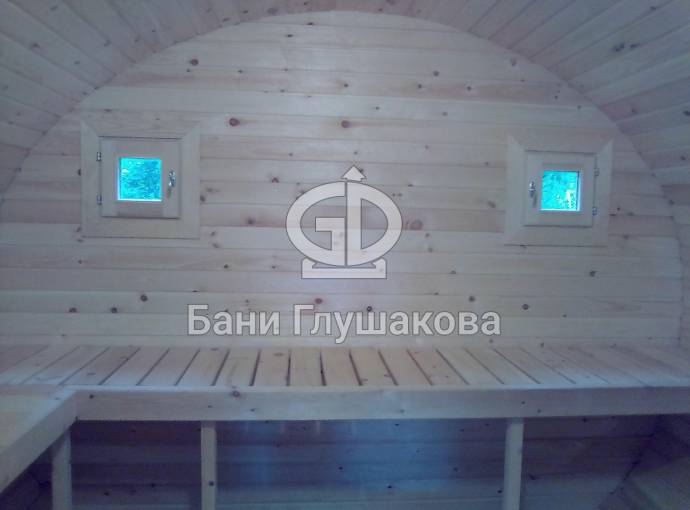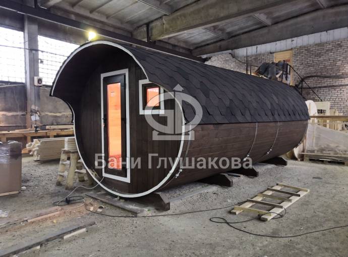 Это просто МЕГА БАНЯ! Овальная баня бочка габаритами 3х5 метров — сборка возможна только на участке. Высота потолка 2,40 см.