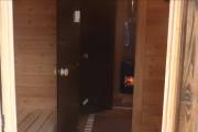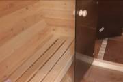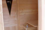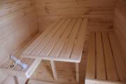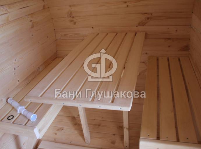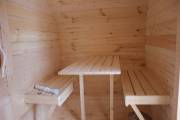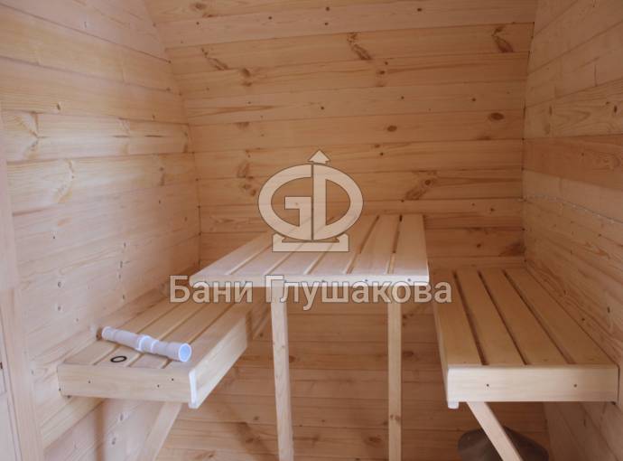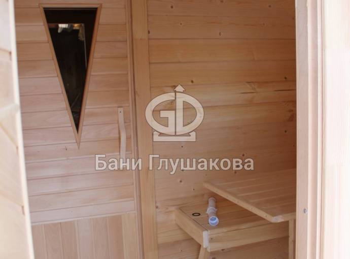 Внутри 3 помещения: предбанник, моечная/душевая комната, сауна. Снаружи полноценная терраса со скамеечкой и уличным освещением. Входная дверь несколько смещена в сторону — для удобства нахождения на террасе и в предбаннике.