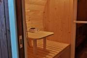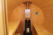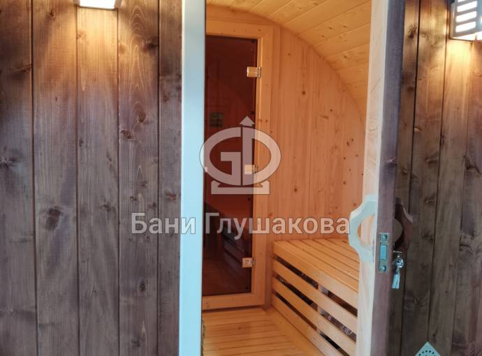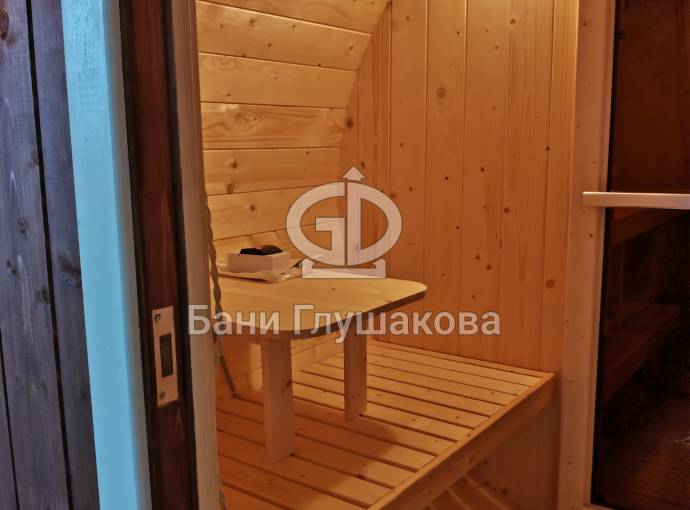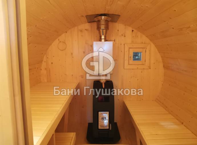 Это классическая овальная баня бочка из ели 4 метра + козырёк. В ней всё продумано для комфортного парения: поставлена мощная печь Лагуна марки «Теплодар», полки расположены на разных уровнях. Для любителей интенсивного пара полок повыше, для нежных созданий — пониже.