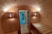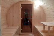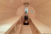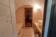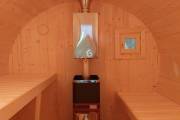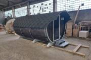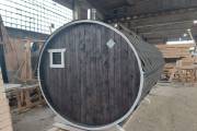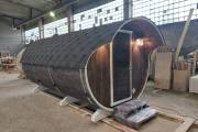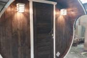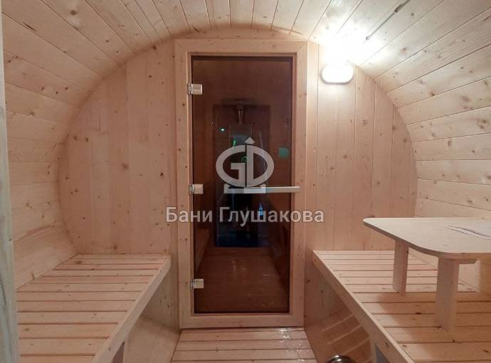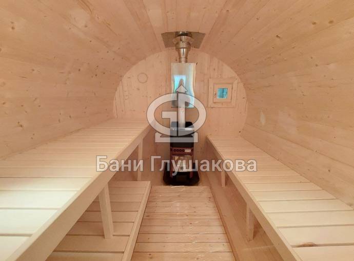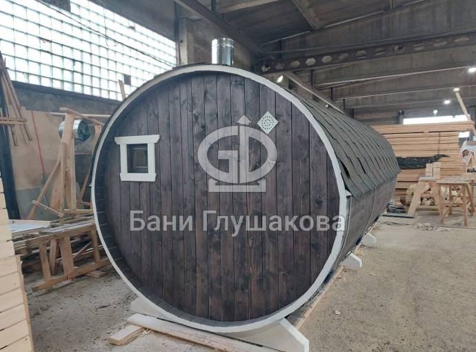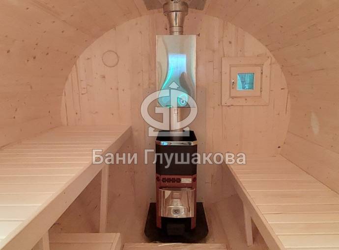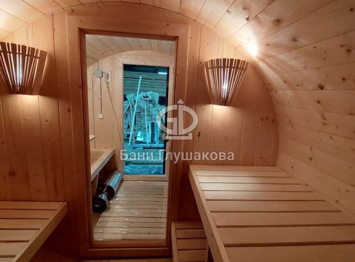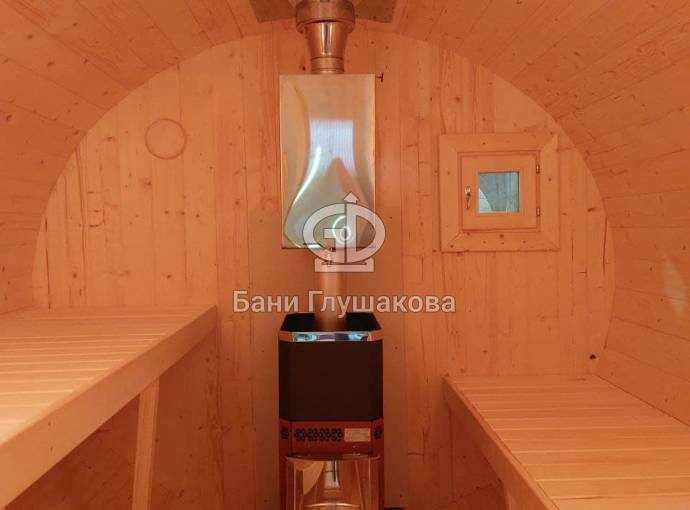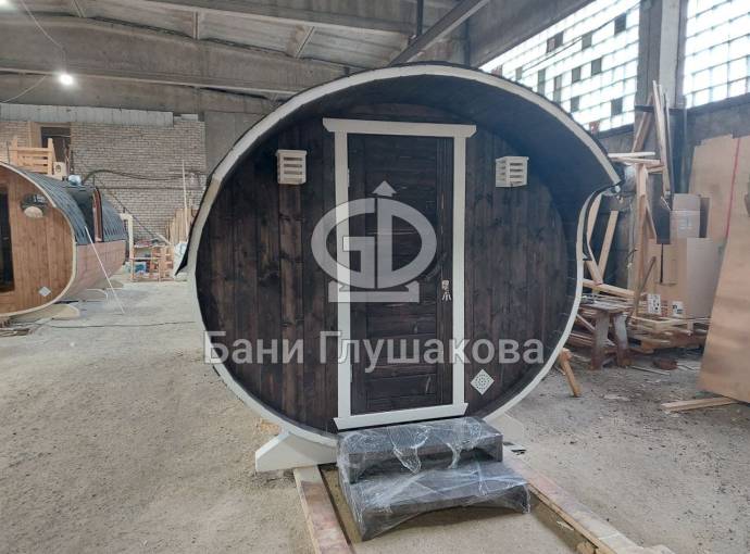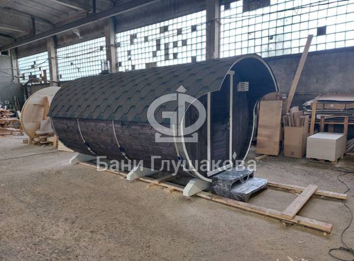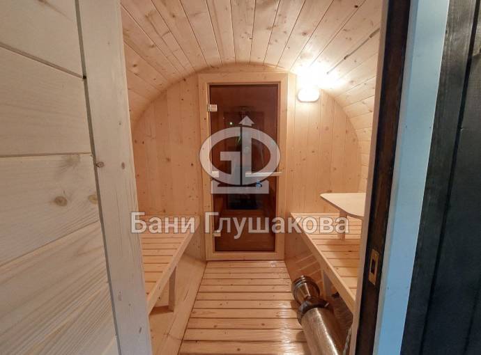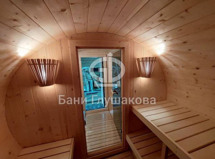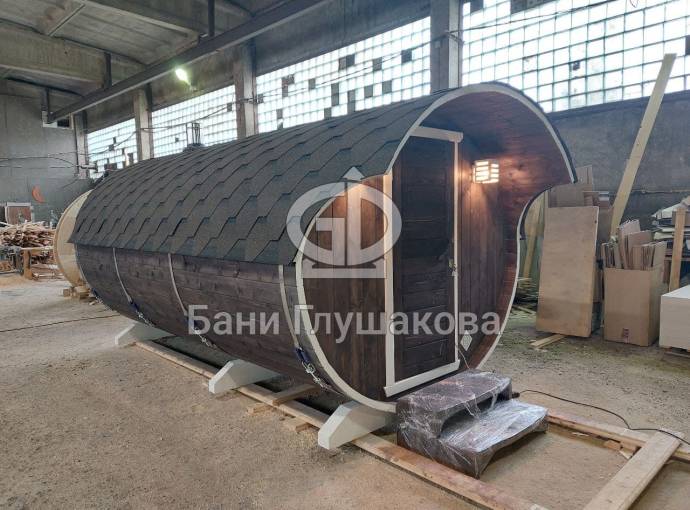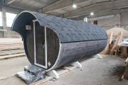 Небольшая компактная баня бочка овальной формы с козырьком. Изготовлена из еловой бочковой доски.