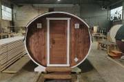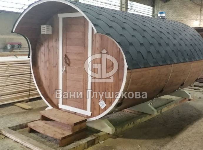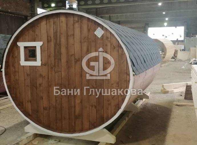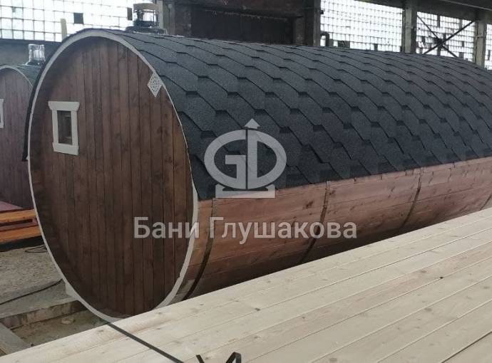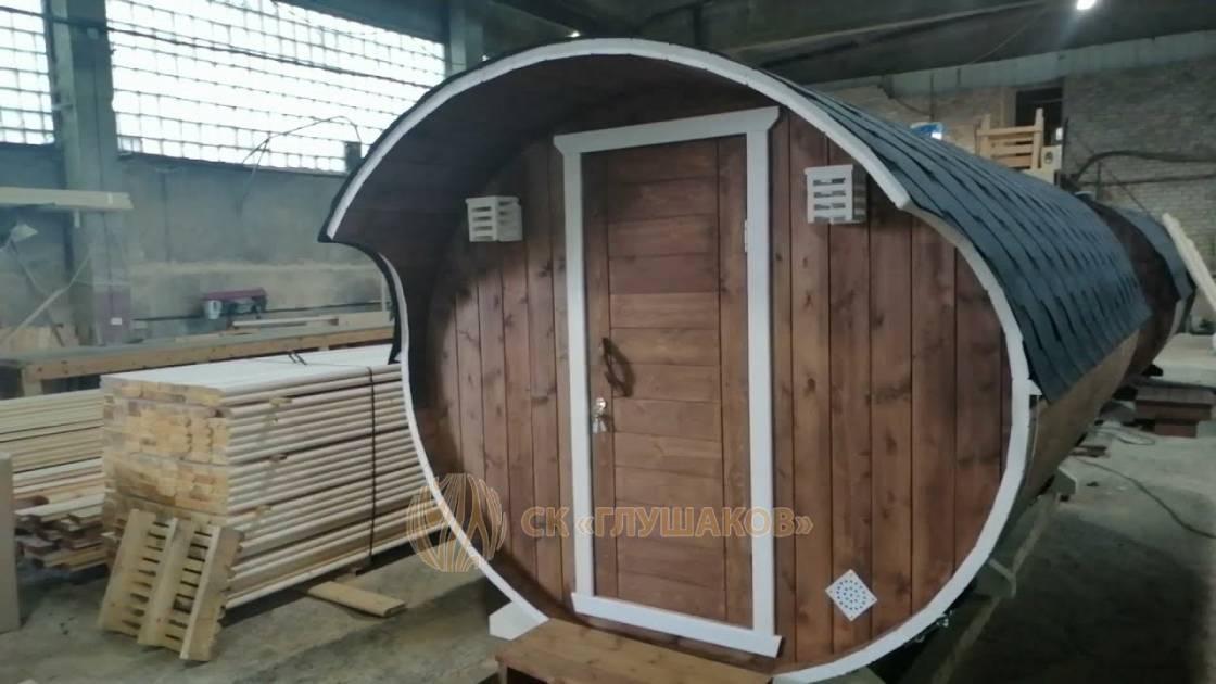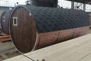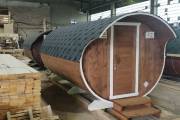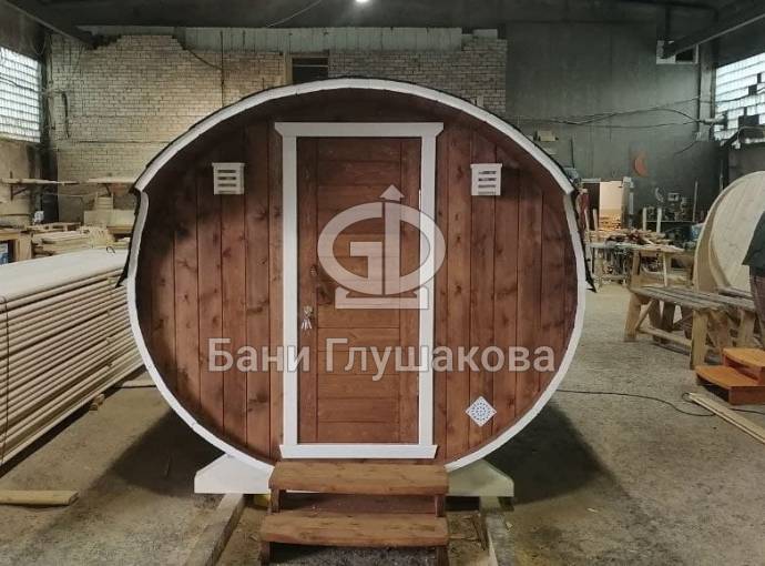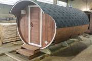 Закончили строительство новой овальной бани бочки на продажу. Сборка из бочковой доски из кедра. Баня классического формата — четырёхметровая на 2 помещения.