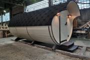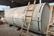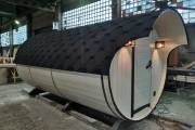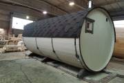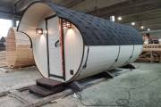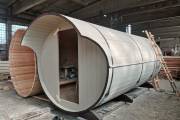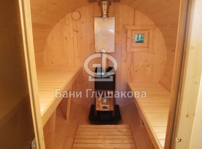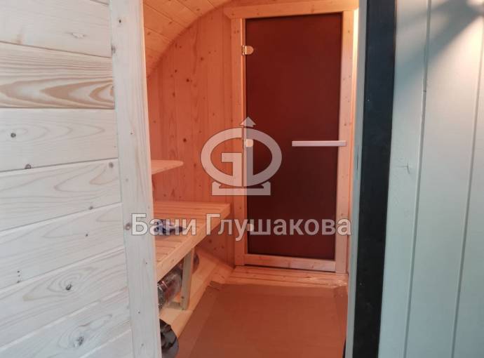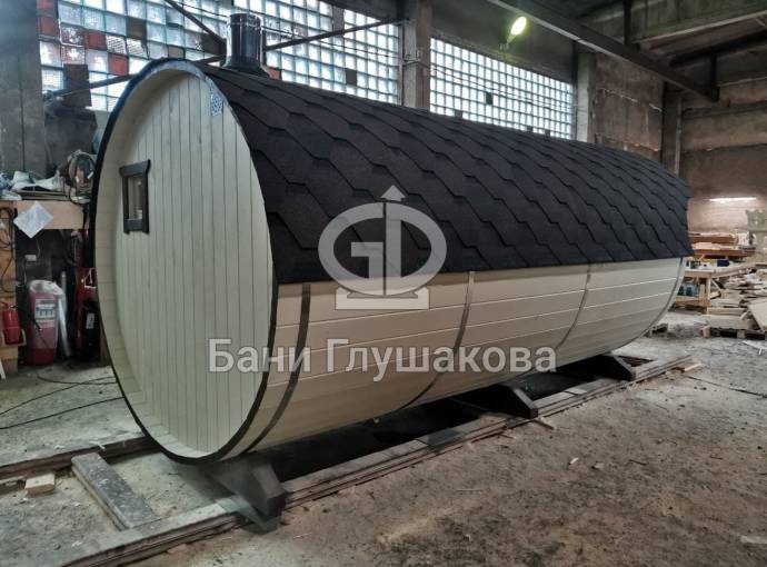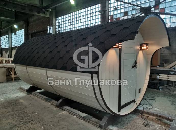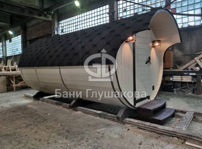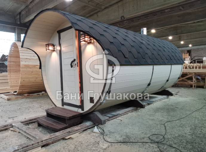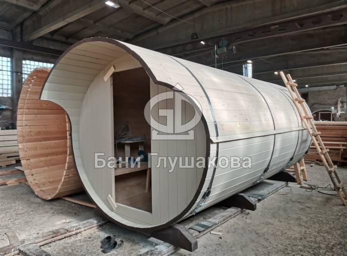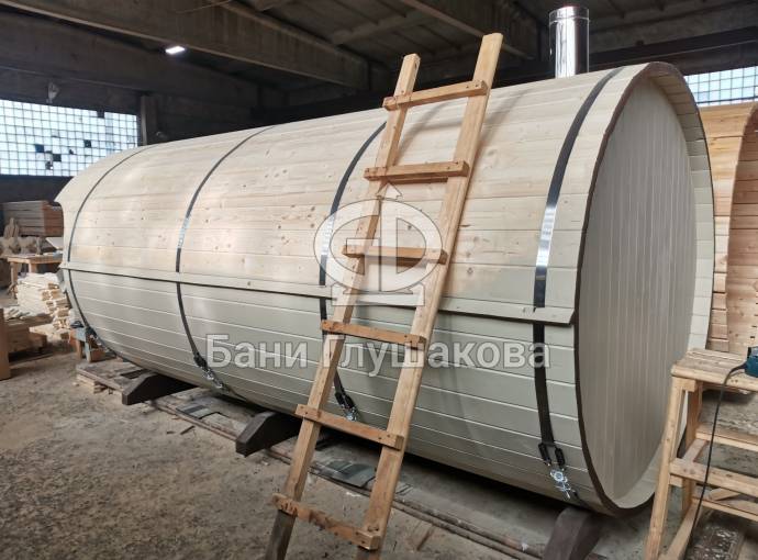 Баня овальная длиной 4 метра без учёта козырька. Изготовлена из еловой бочковой доску камерной сушки. Стянута обручами из нержавеющей стали. Обручи оснащены компенсационными пружинами — не нужно будет подтягивать.