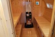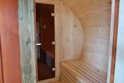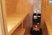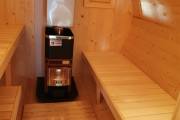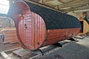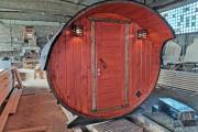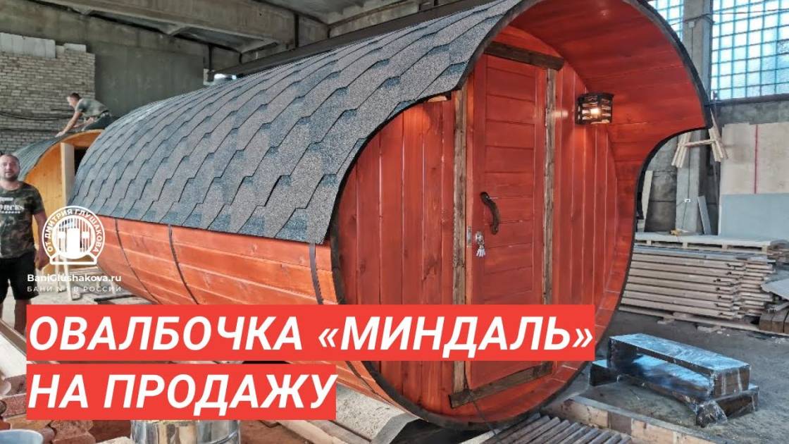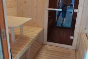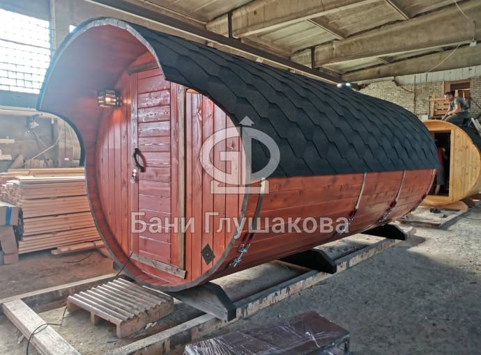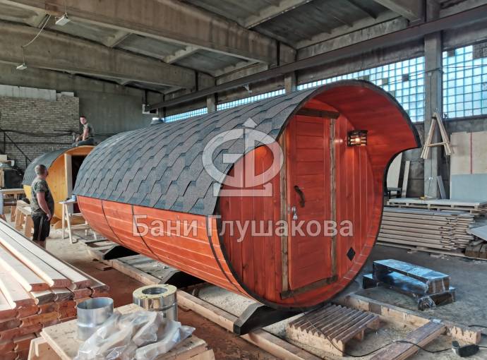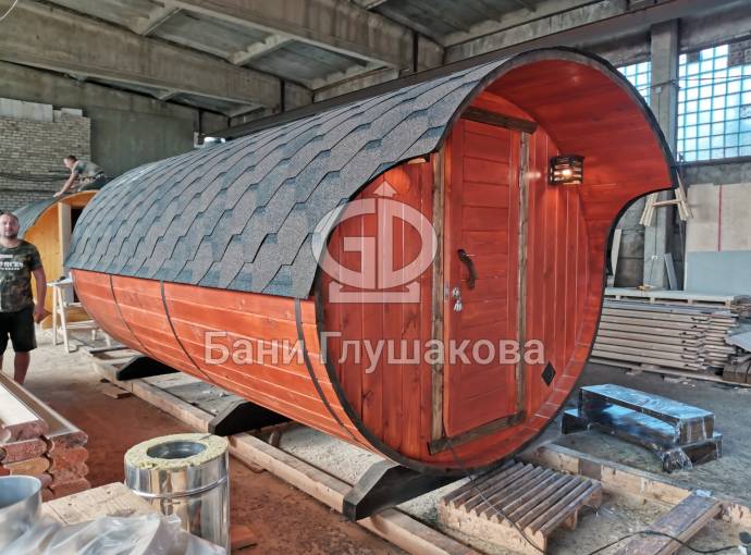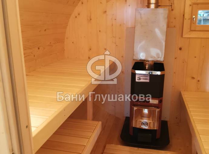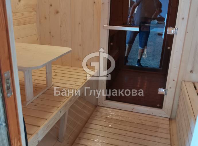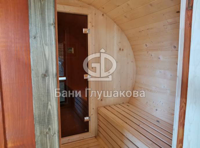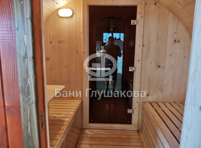 Баня овальной формы, длина по основанию 4 метра + козырёк. Внутри 2 отделения: предбанник и парная. В предбаннике стоит скамейка с откидной крышкой — тут можно хранить вещи. Есть столик. Сделана аккуратная электропроводка, поставлены автомат, розетки, выключатели.
