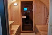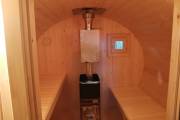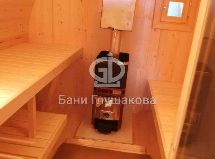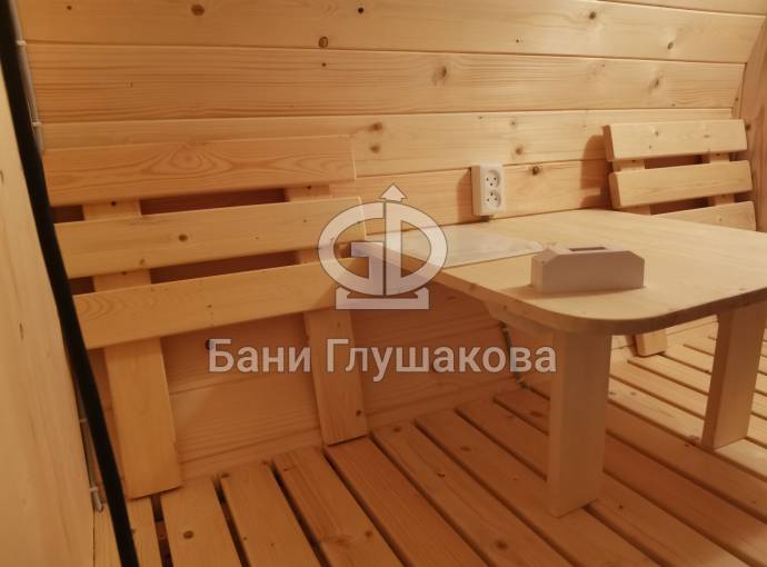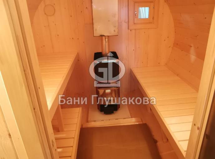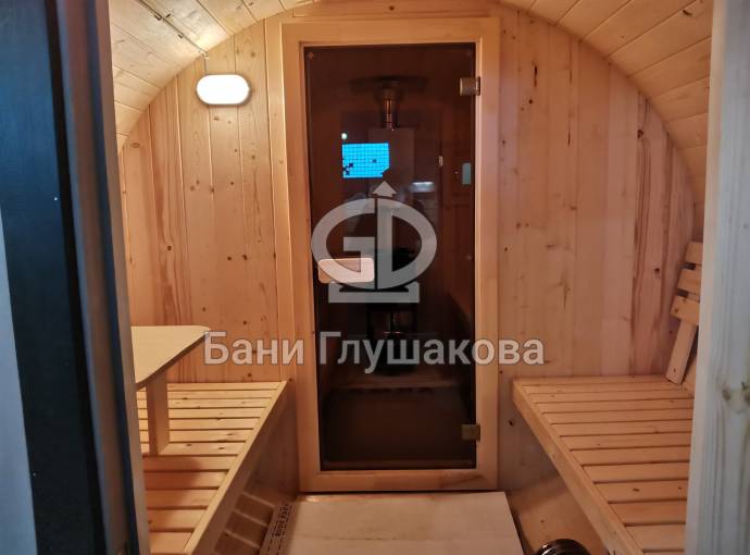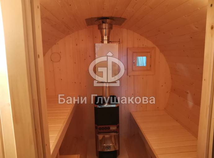 Это стандартная четырёхметровая баня бочка овальной формы под ключ. Здесь всё сделано для высокого уровня комфорта и нет излишних элементов, которые влияют на стоимость бани.