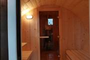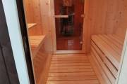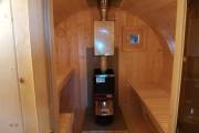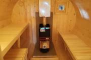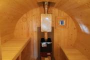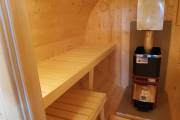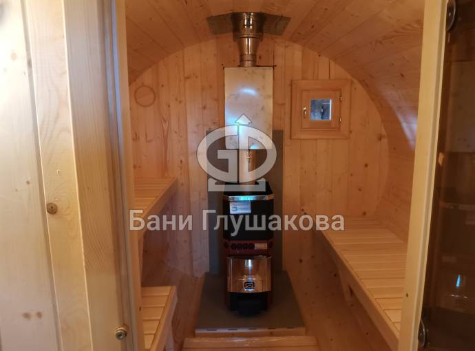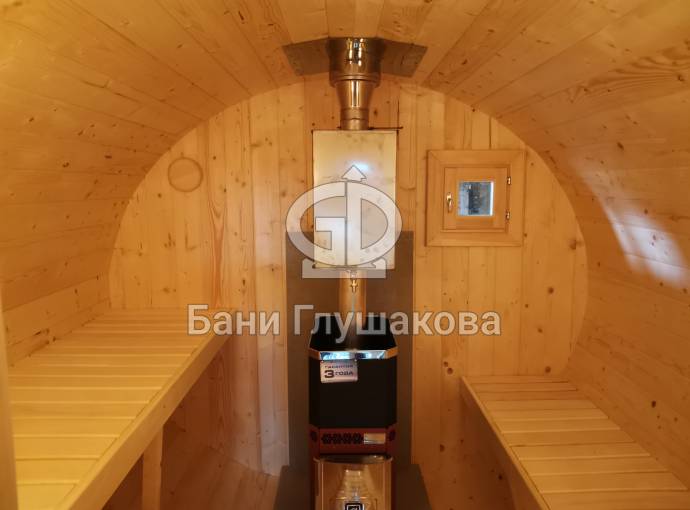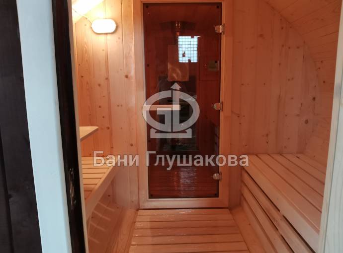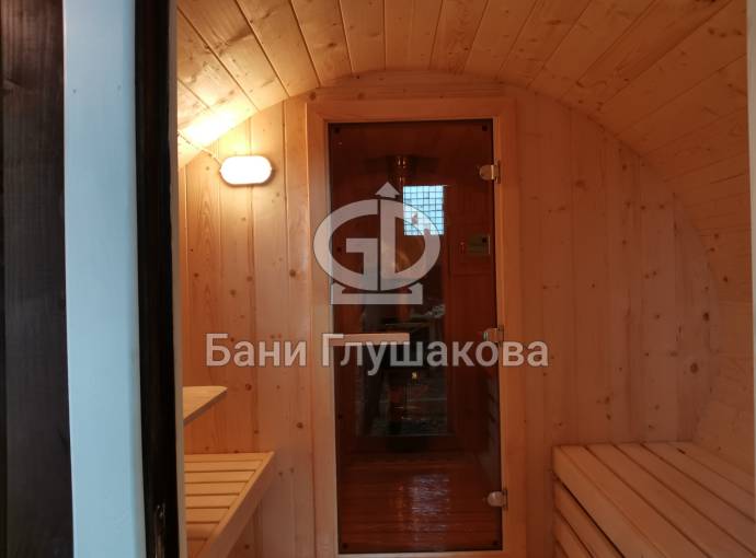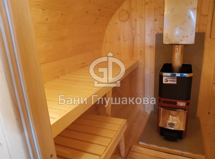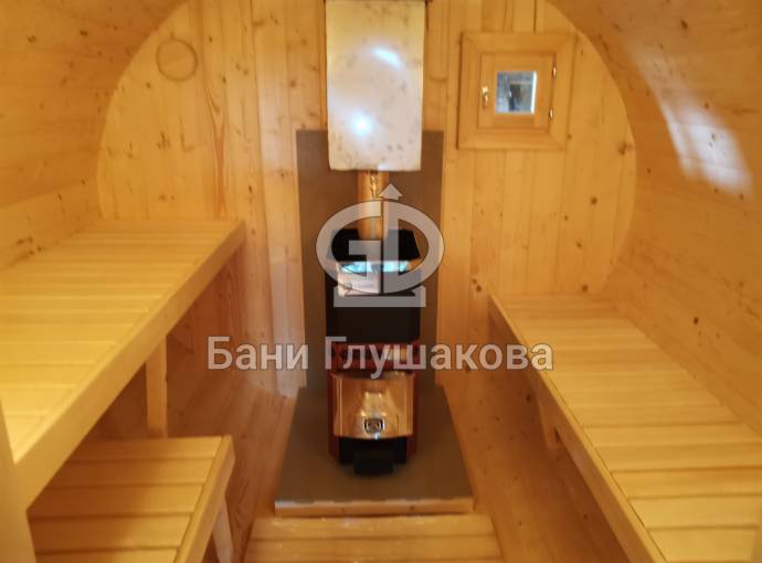 Баня овальной формы стандартного размера 4 метра с двумя отсеками: предбанник и парная. Душа и отдельной помывочной нет. В предбаннике установлены скамейка с откидной крышкой (внутри место для хранения), столик. Межкомнатная дверь — стеклянная с магнитным замком. Самый лучший вариант для помещений с повышенной влажностью.