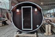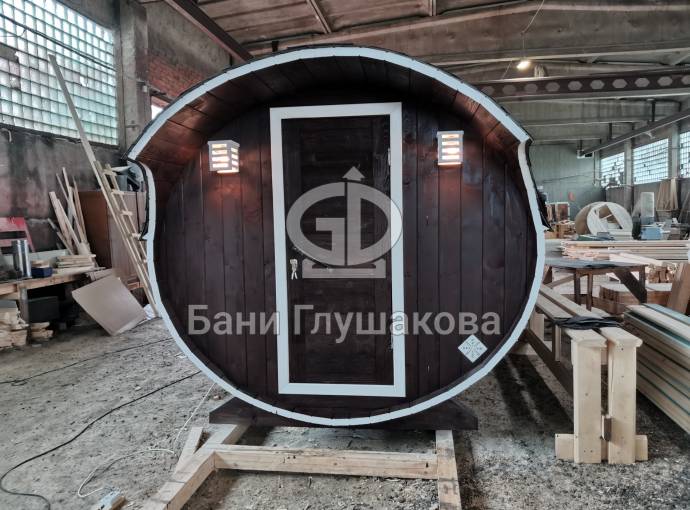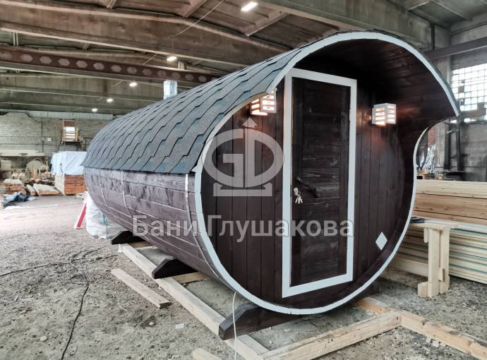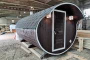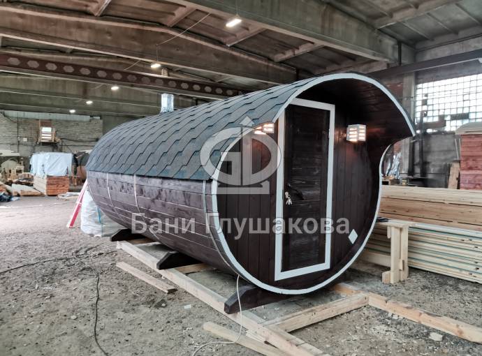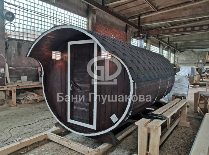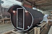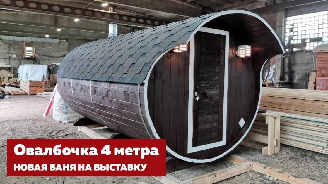 Выставочная овальная баня бочка была собрана в середине июня 2020 и сейчас находится на выставочной площадке на Пятницком шоссе в Баранцево (Москва).