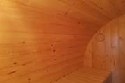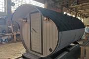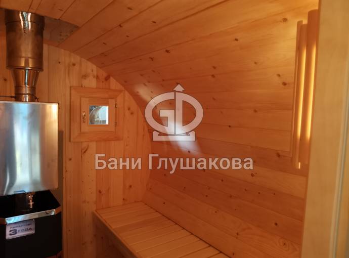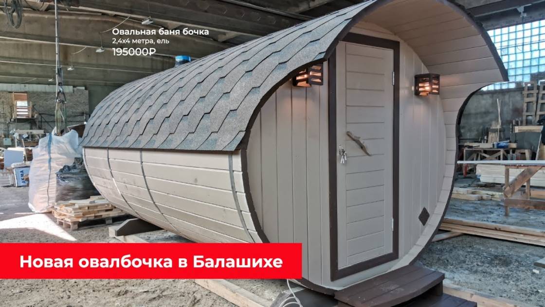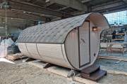 На выставочную площадку в Балашихе привезли новую четырёхметровую баню бочку кофейно-молочного цвета. Это самая популярная баня сезона 2020 — больше недели-двух такие на выставке не задерживаются.