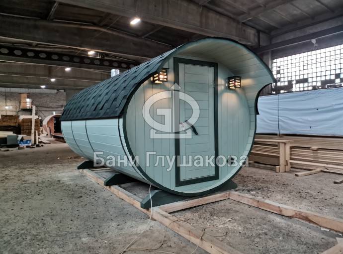Это четырёхметровая баня бочка овального типа с козырьком. Построена из еловой бочковой доски. Продаётся конкретно эта баня, которая изображена на видео.