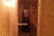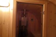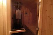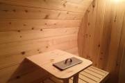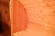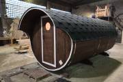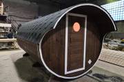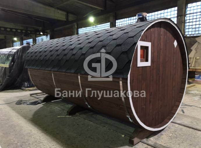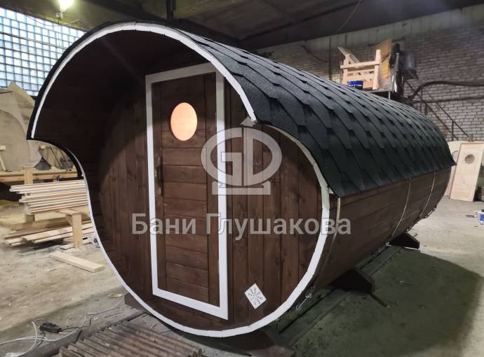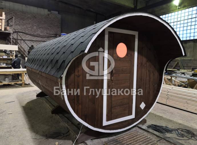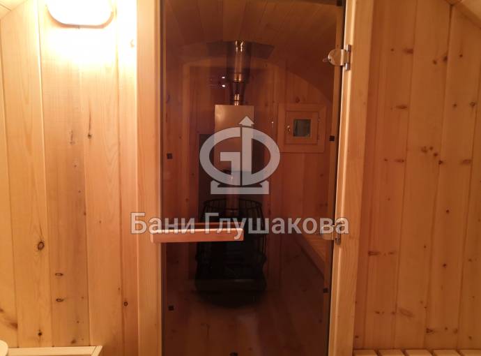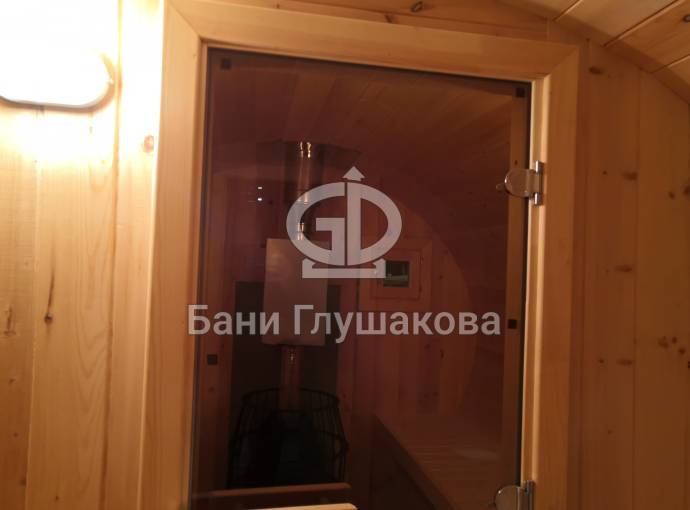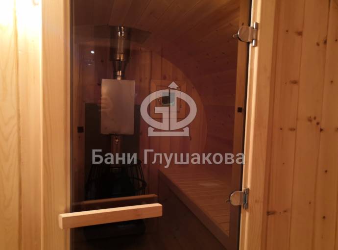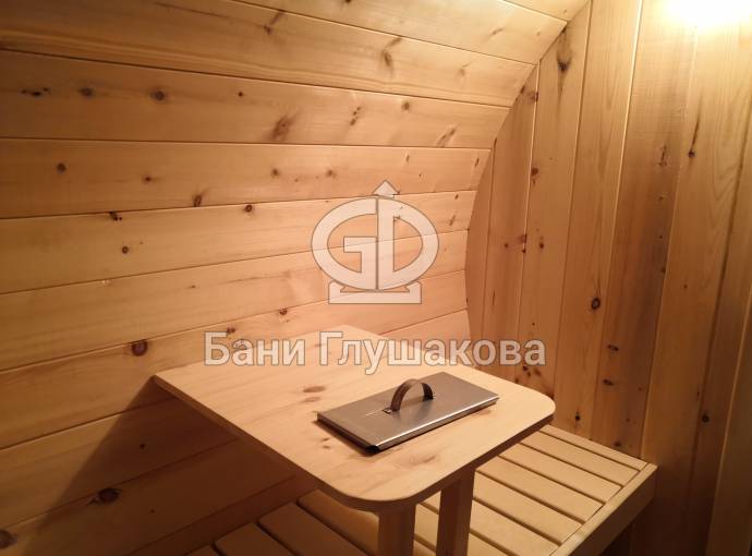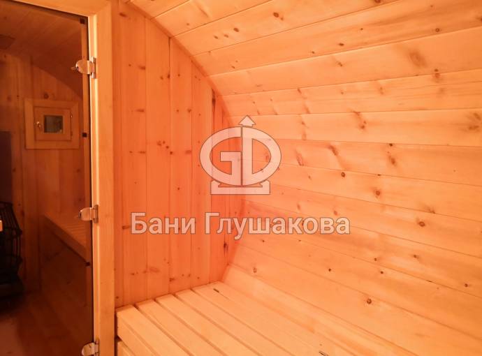 Овальная баня бочка имеет преимущество перед круглой — места в ней действительно больше, мыться в ней удобнее. Эта модель состоит из двух отделов: комнаты отдыха и парной, которые разделены стеклянной дверью для бань и саун с магнитным замком. В предбаннике установлены скамейки (одна из них с откидной крышкой), столик, светильник. В парной поставлена печь Бочонок, два полога по бокам от печи, положен трапик. В бане сделана электропроводка, установлены светильники и вентиляция. Наружная покраска «Биотекс».