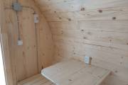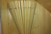 В предбаннике размещены скамеечки и столик — всё очень удобно и красива. Все поверхности тщательно зашлифованы, все плинтуса и наличники аккуратно подогнаны, электропроводка разведена эстетично.