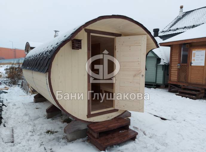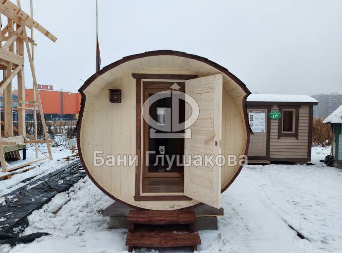 Новый выставочный образец овальной бани бочки для выставочной площадки в Великом Новгороде. Баня доступна к осмотру и покупке.