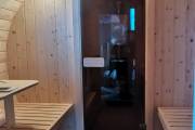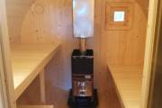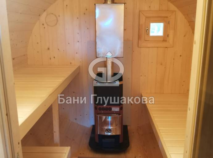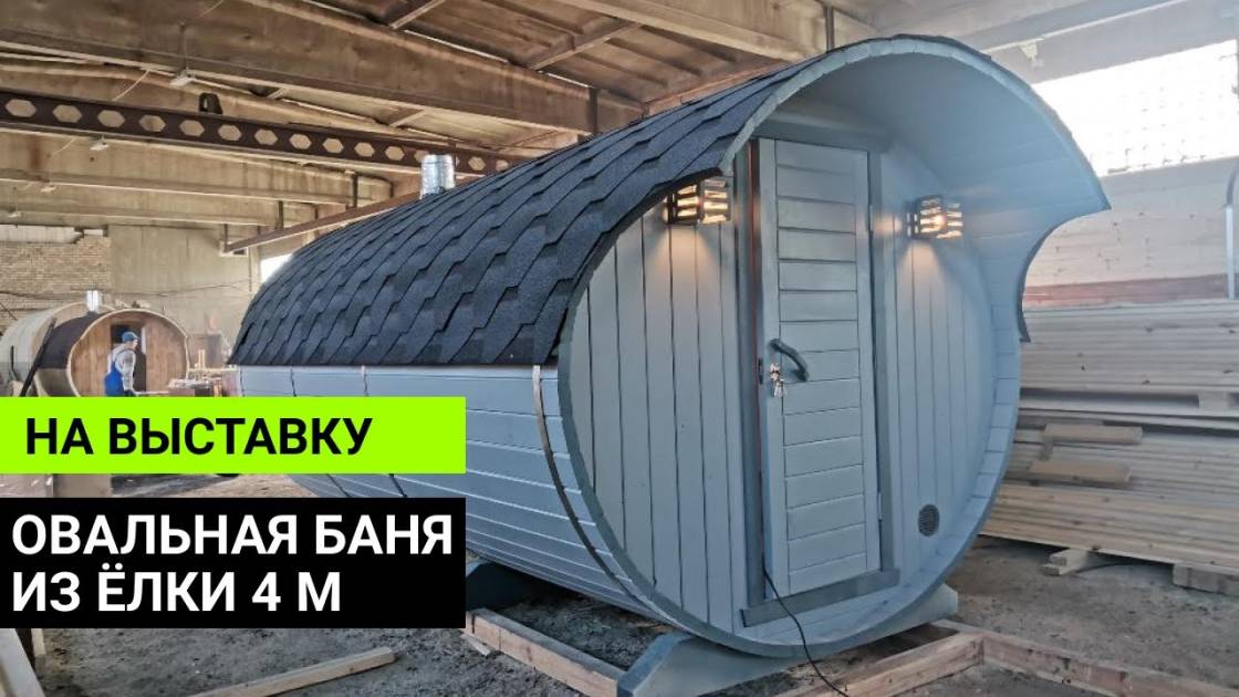 Это классическая овальная баня бочка из ёлки, длина по основанию 4 метра + козырёк. Внутри 2 помещения: комната отдыха и парная.