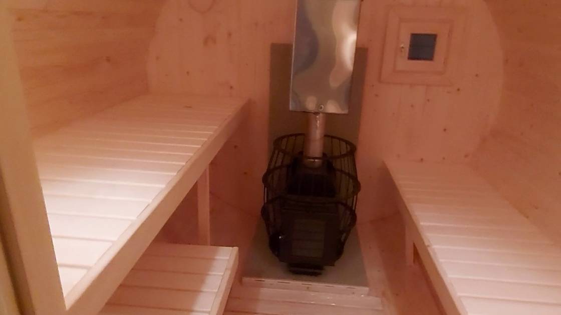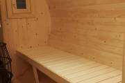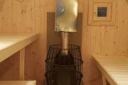 Баня небольшая — 4 метра в длину, не считая козырька. Внутри всего 2 отделения: парная и предбанник. Это скорее типичная сауна для дачи, чем классическая баня, заменяющая полноценную ванную комнату.